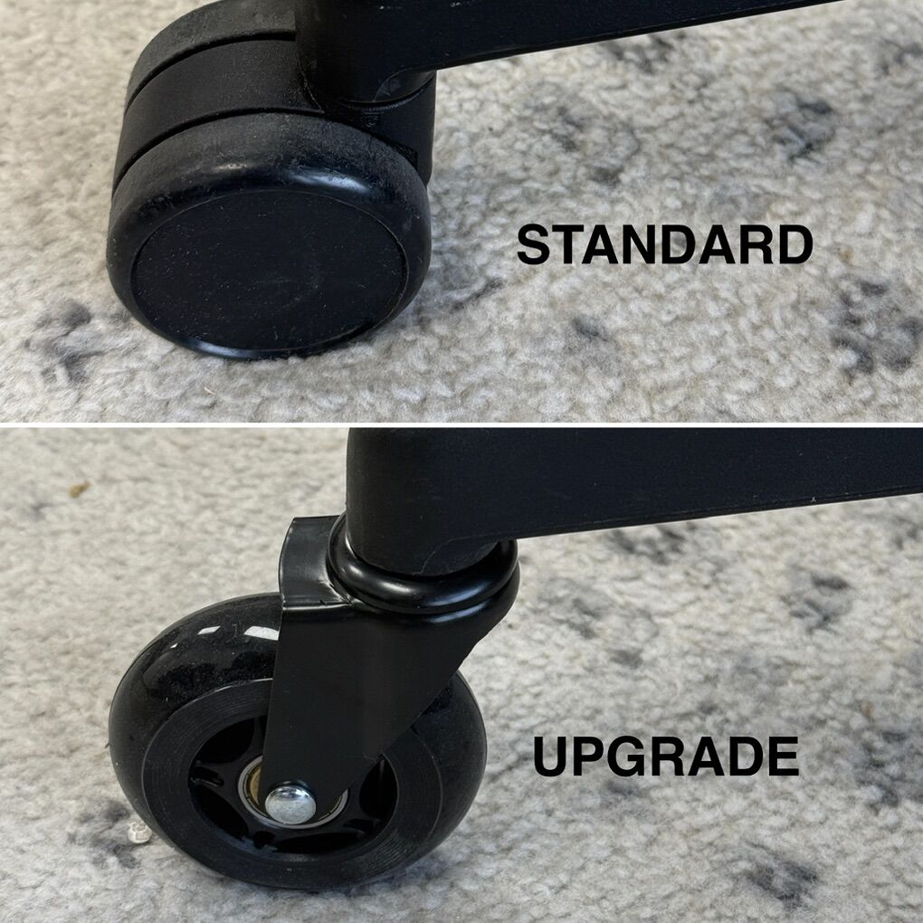 Original standard caster wheels included or we can swap with upgraded rollerblade rubber wheels (+$30/ chair) for ease of use and to protect floors from scratches.