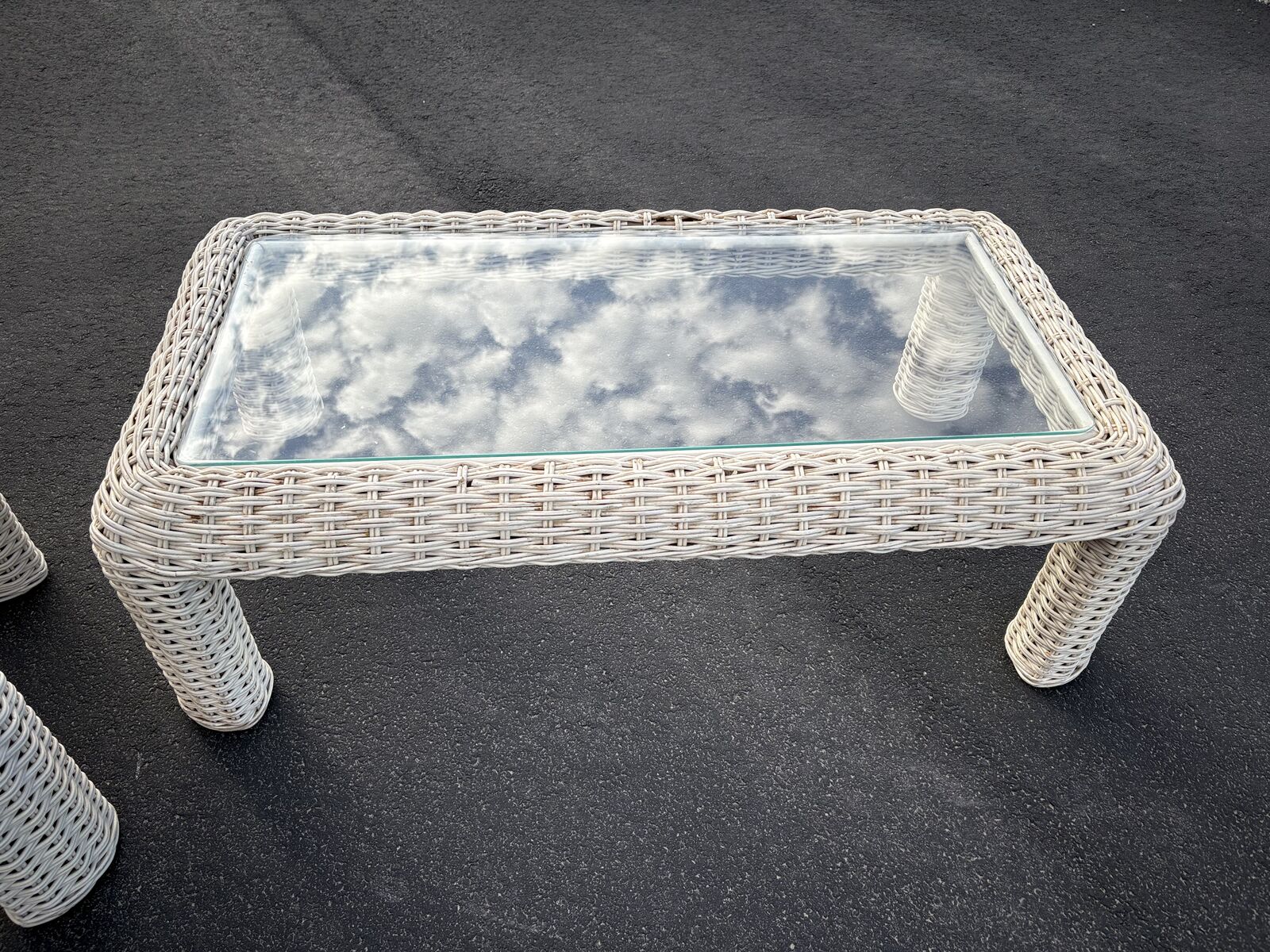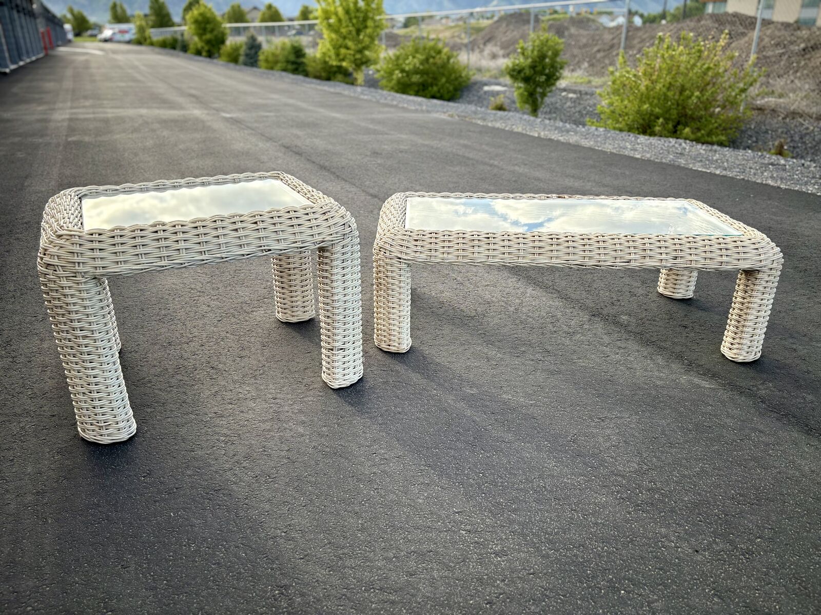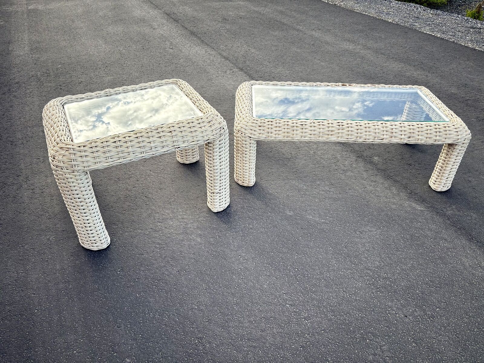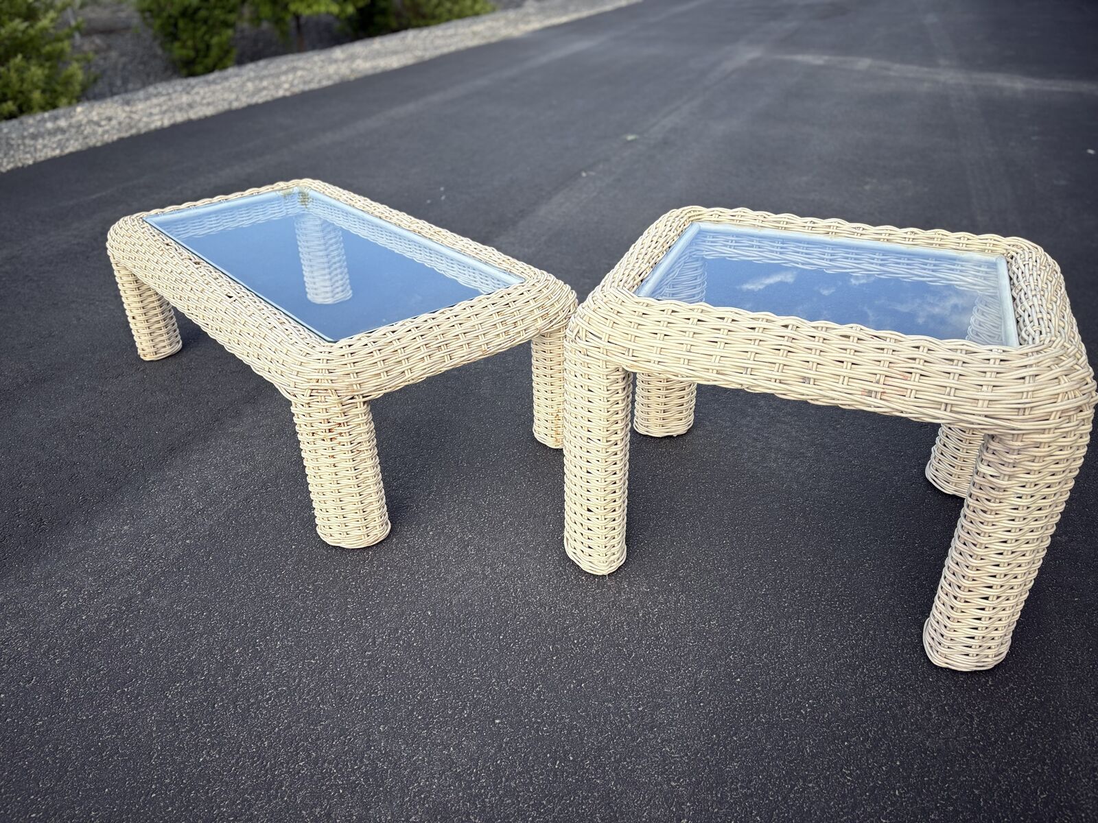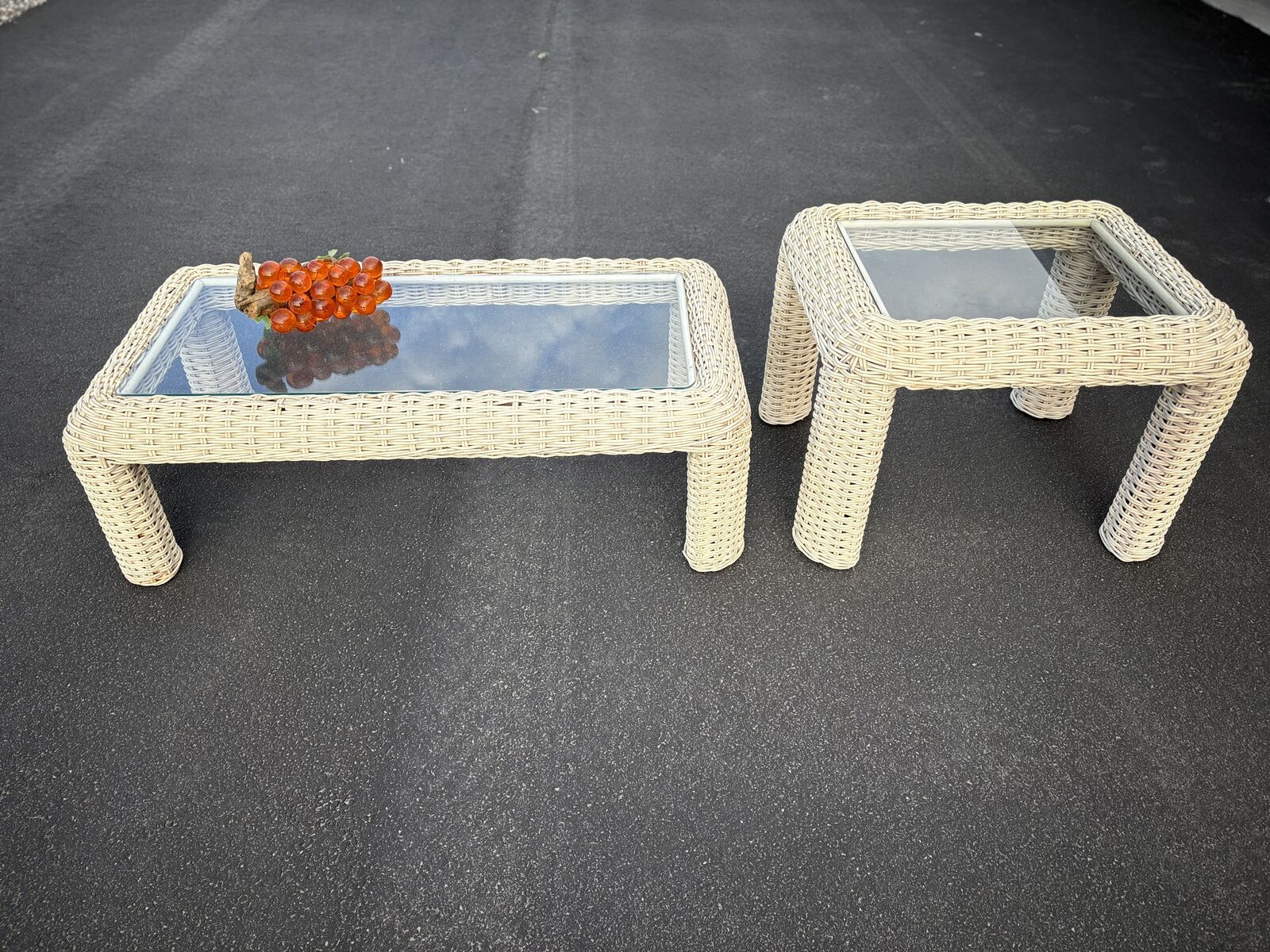 VenmoFantastic Mid Century wicker rattan coffee table plus side table. Both are in fantastic consition, including the glass tops. Just $120 for the set. Dimensions : side table measures: 32" wide by 26 deep x 22" tall Coffee Table measures 51" wide x 27 deep x 16.5 tall