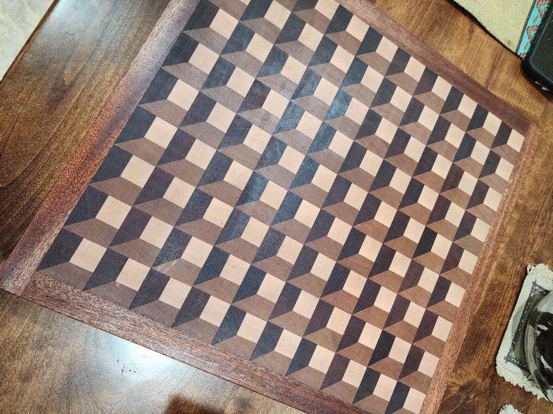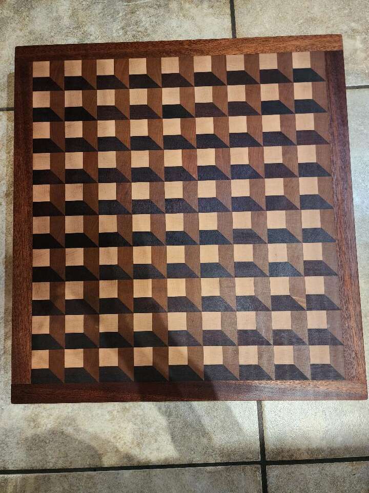 Mahogany, Cherry and Maple. 17"x18"x1 1/2". Has non slip feet.