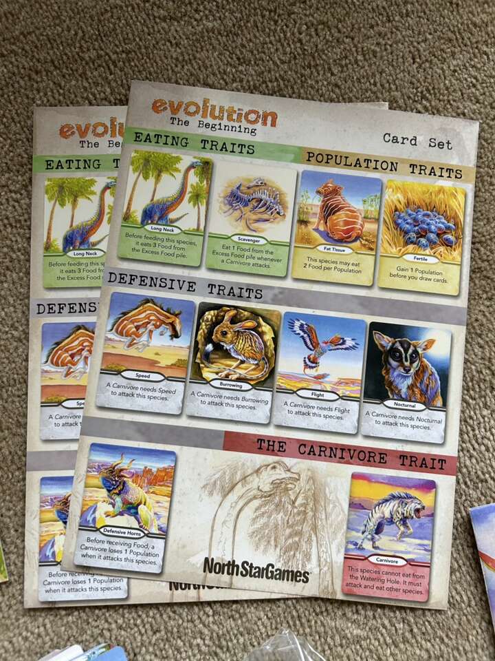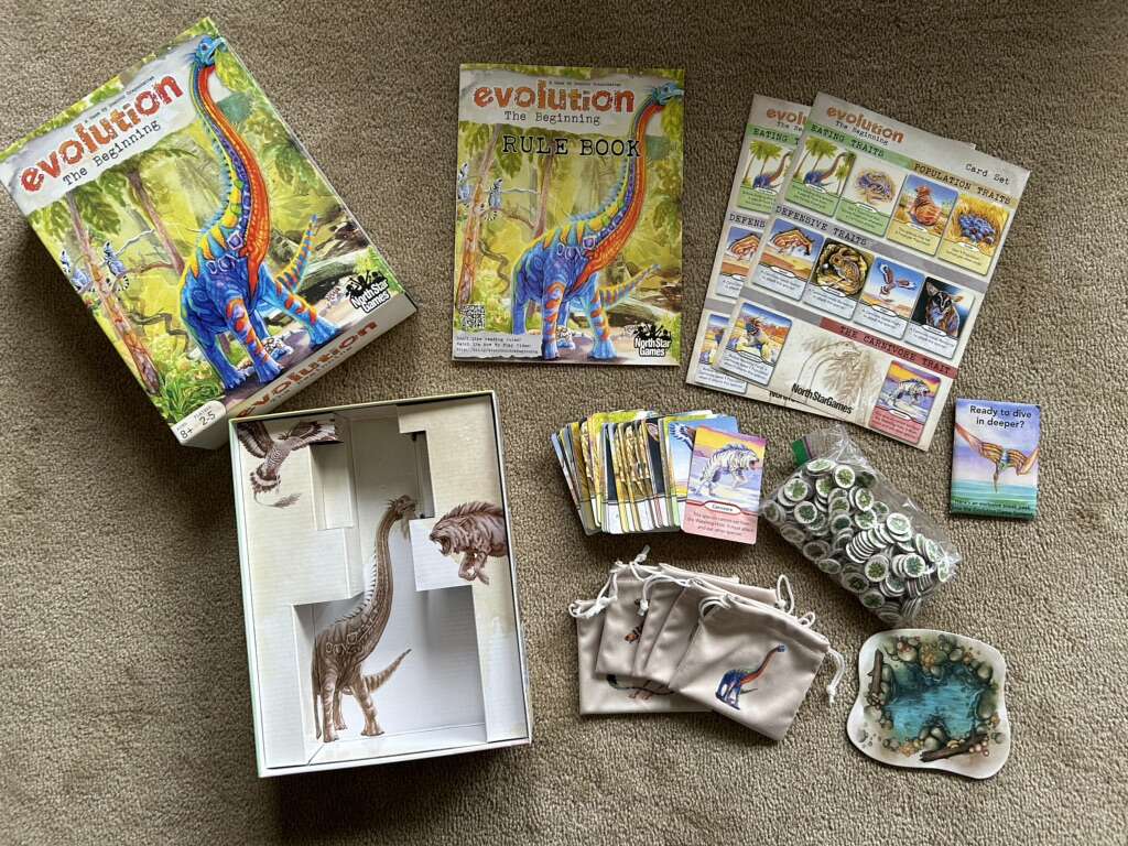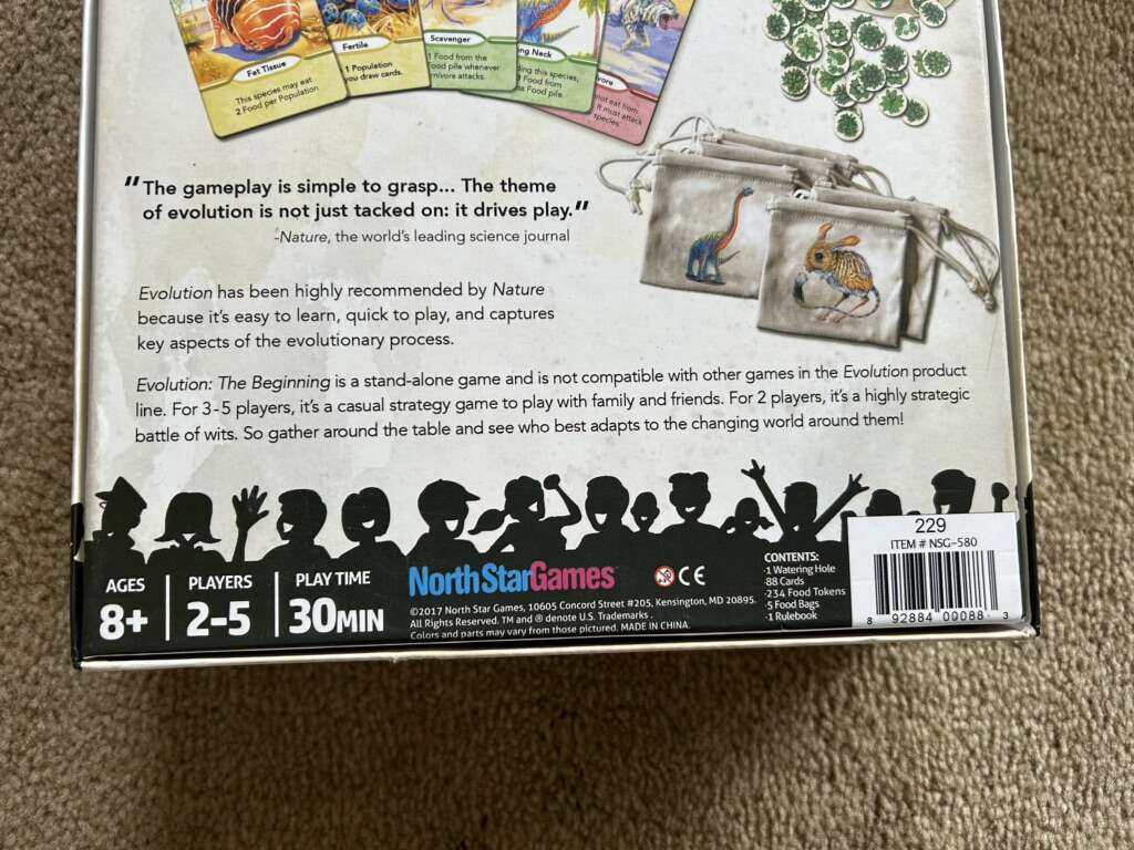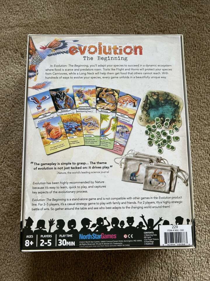 COMPLETE Evolution: The Beginning. A game by Dominic Crapuchettes, North Star Games, 2017. Age 8+, 2-5 players. A standalone game, not compatible with other Evolution games. Complete, no missing pieces. Excellent condition. Text only. Cash or Venmo. Discount on multiple items.