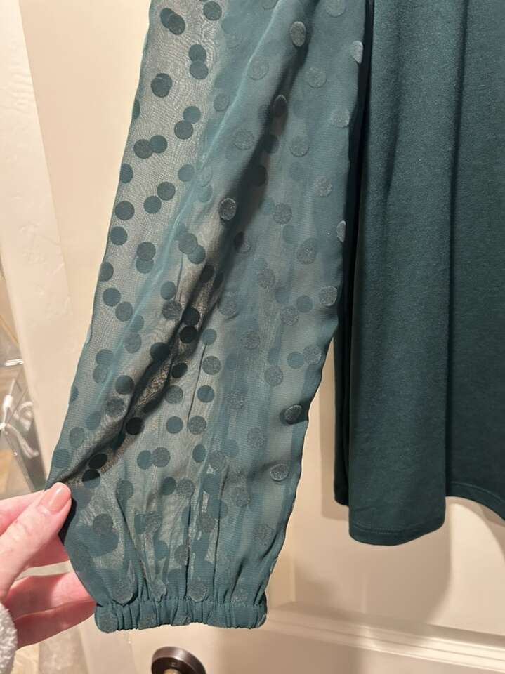 VenmoLike new worn once Ann Taylor Loft long sleeve dark green round neck shirt. Women’s size XS. Gathered puff shoulders at the top of sheer long sleeves with velvet polka dot circle. Elegant and practical. Elastic wrist bands allow for 3/4 length option as well. Clean smoke free home. No flaws stains or defects. Perfect for any party or celebration. Cash or Venmo. Porch pick up from Alpine.