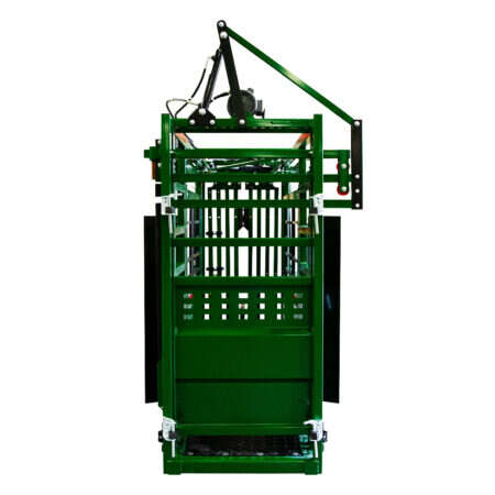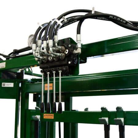 Hydraulics are controlled from the mounted valve bank: Cattle Head Gate, Tail Gate, Squeeze, Optional Head Sweep