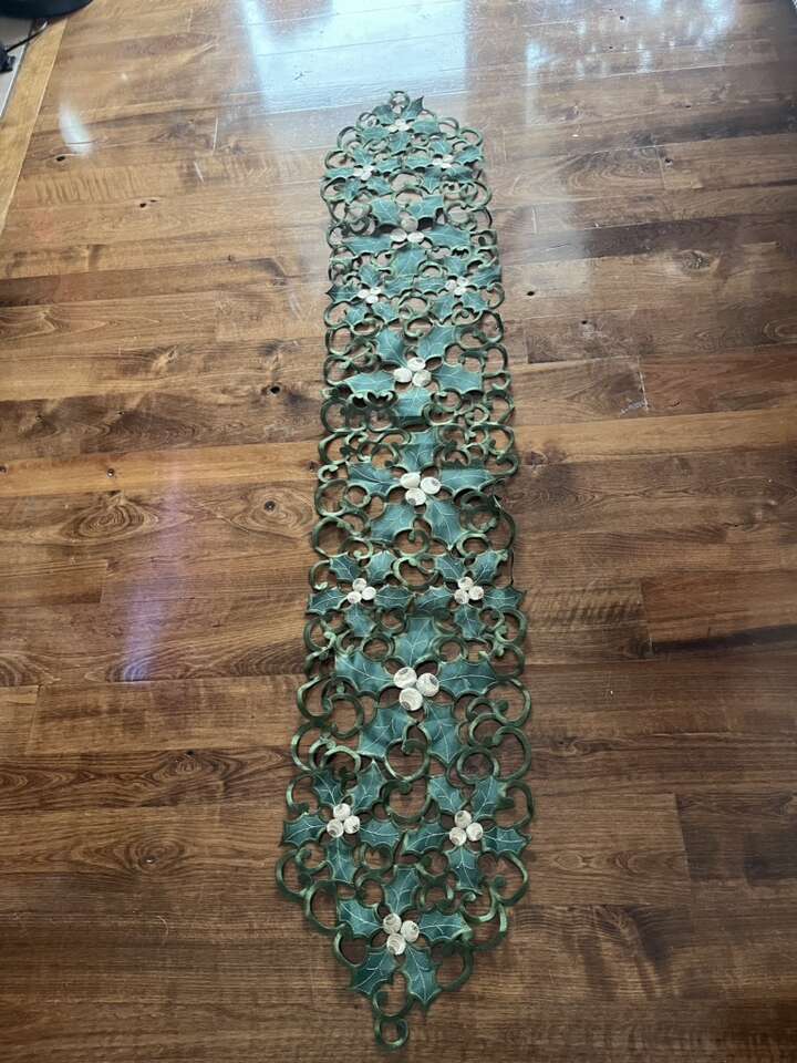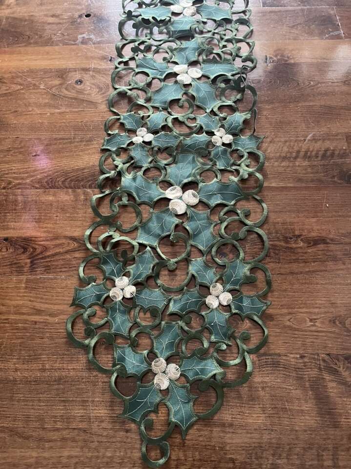 69 by 13 long holiday runner with holly intricate leaves dark green with gold
