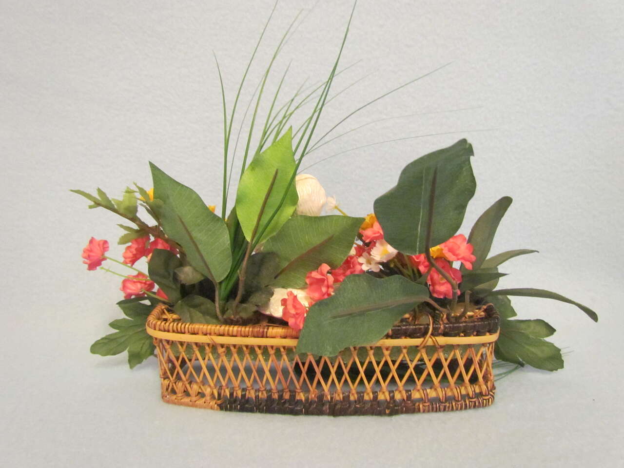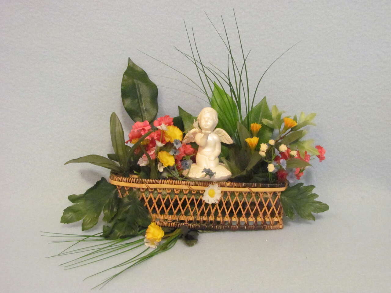 $3 Floral Angel Baby Decoration - the angel's arm has been repaired, as it broke off, so it was glued back on - please see pictures. (Entire decoration measures approximately 12" W x10" High x 7.5" Deep from the bottom to the top of the greenery and side to side from the greenery)