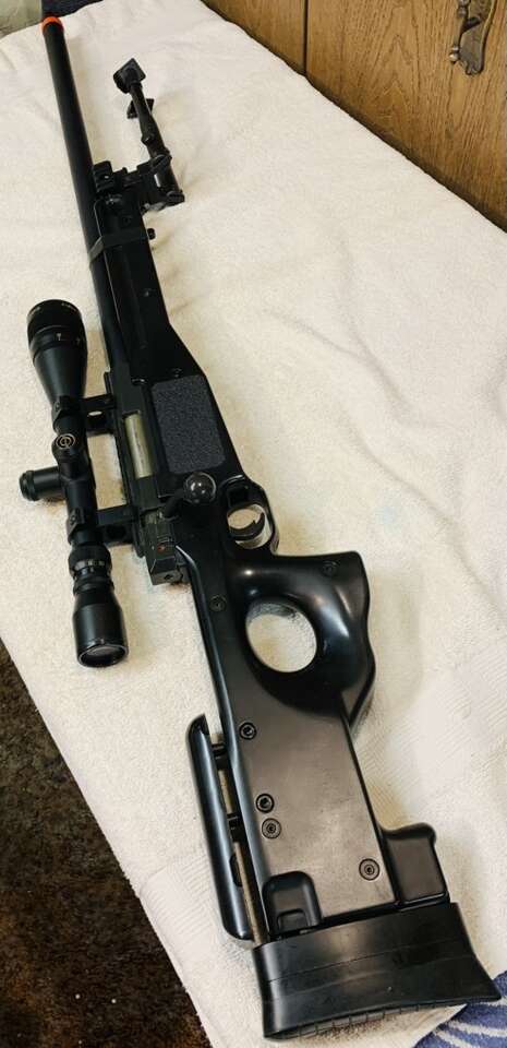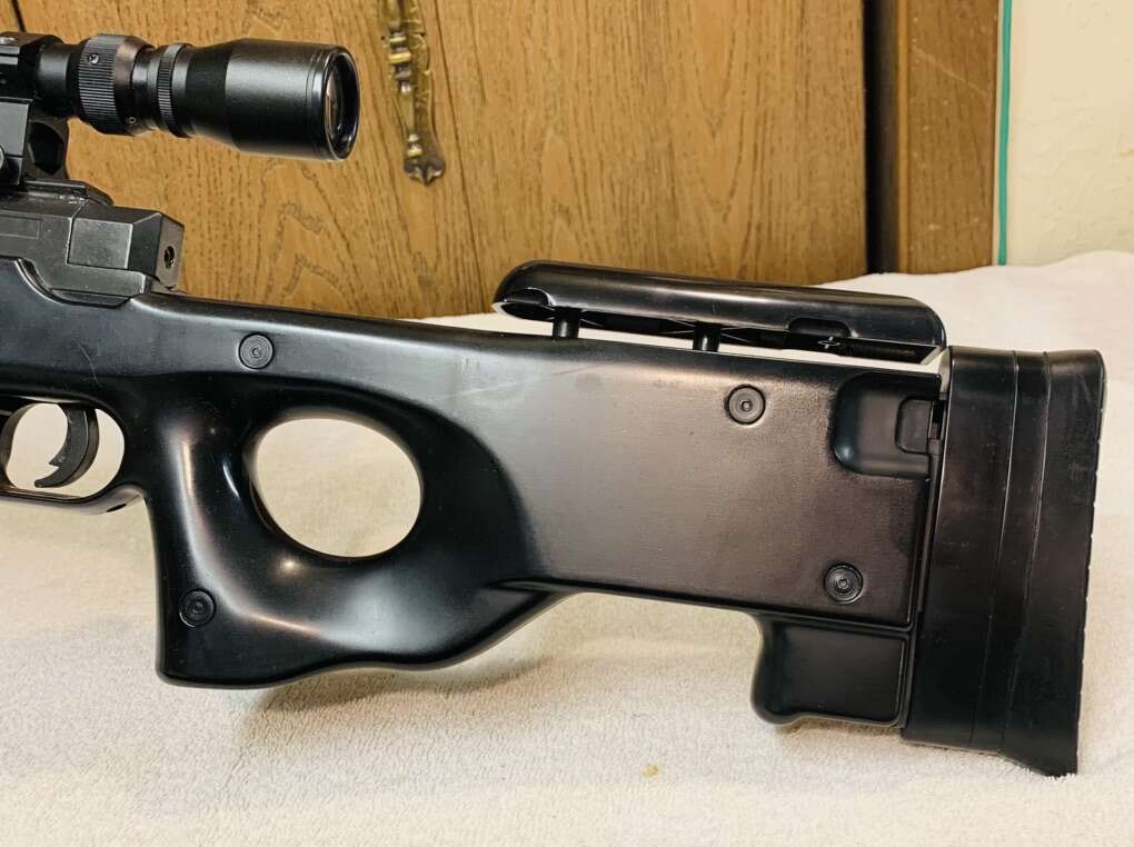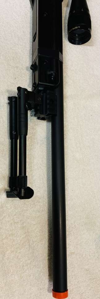 S468 6mm Bolt Action Sniper Rifle. Simmons 4-16 x 40mm Target Scope with Adjustable Objective (10 yds to Infinity). High Rise Scope Mounts. Adjustable Cheek Rest & Stock Length. Removable, Height Adjustable Bi-Pod. 23 Shot Metal/Plastic Magazine. Rifle Construction is a combination of Metal & Plastic. Power Source is a Spring Piston cocked by the Bolt Action & released by the Trigger pull. Velocities: 465 fps with 0.20g BB’s. 425 fps with 0.28g BB’s. 310 fps with 0.43g BB’s. Manual Safety. Rifle Weight is 8.5lbs. Barrel Length is 24” Rifle Length is 48”. Hop-Up Adjustable.