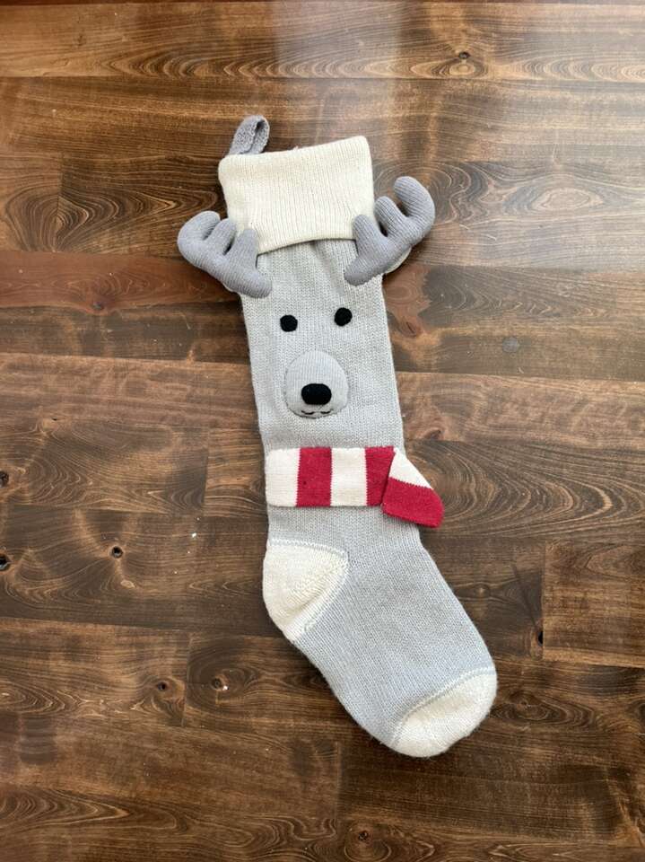 Pottery Barn gray moose Christmas stocking gray/cream 27” with scarf.