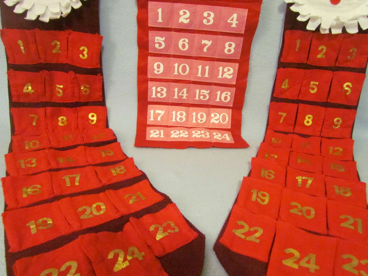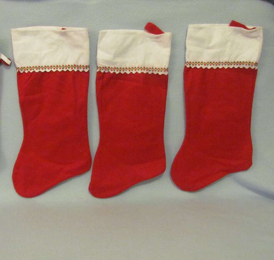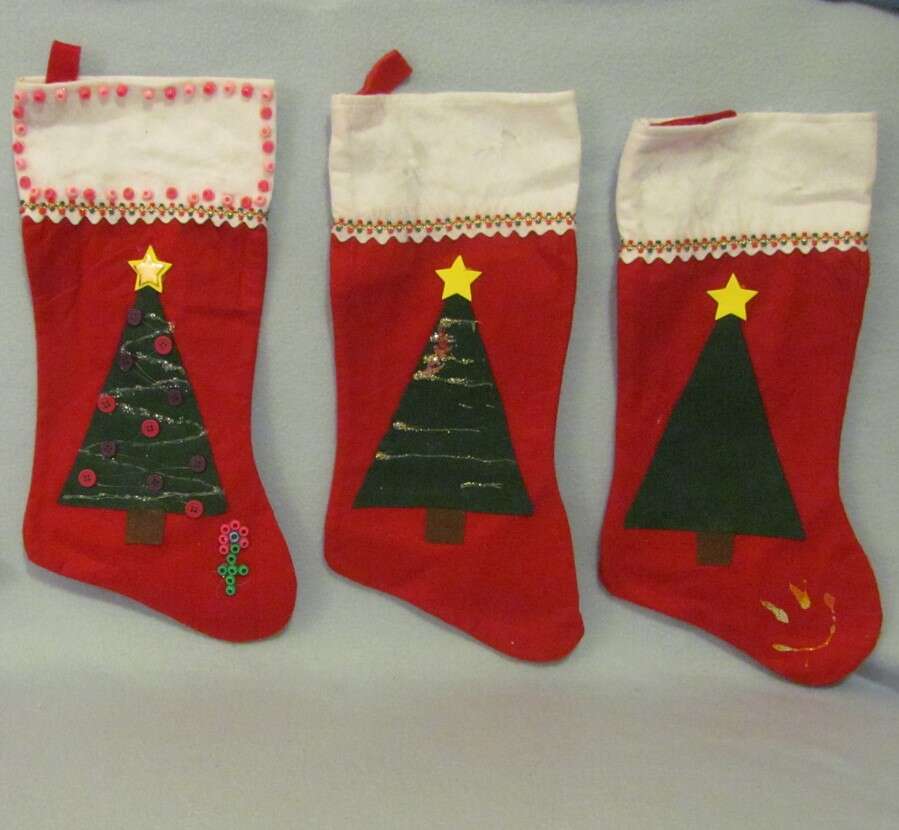 $5 Set of 3 - Kid Decorated (and needs more decorating) Stockings - socks are "technically new" as they were never used as a "filled sock from santa", only decorated and some of the decorations have come off in storage and some of the decorating was never finished, so a few kidos could have fun finishing decorating these with beads and/or other decorating items with fabric or hot glue. They'd be excellent crafts to complete & use as a secret santa filling the stockings and surprising a friend/loved one with.