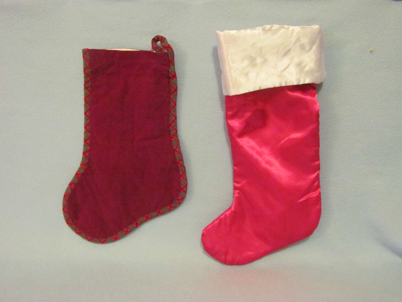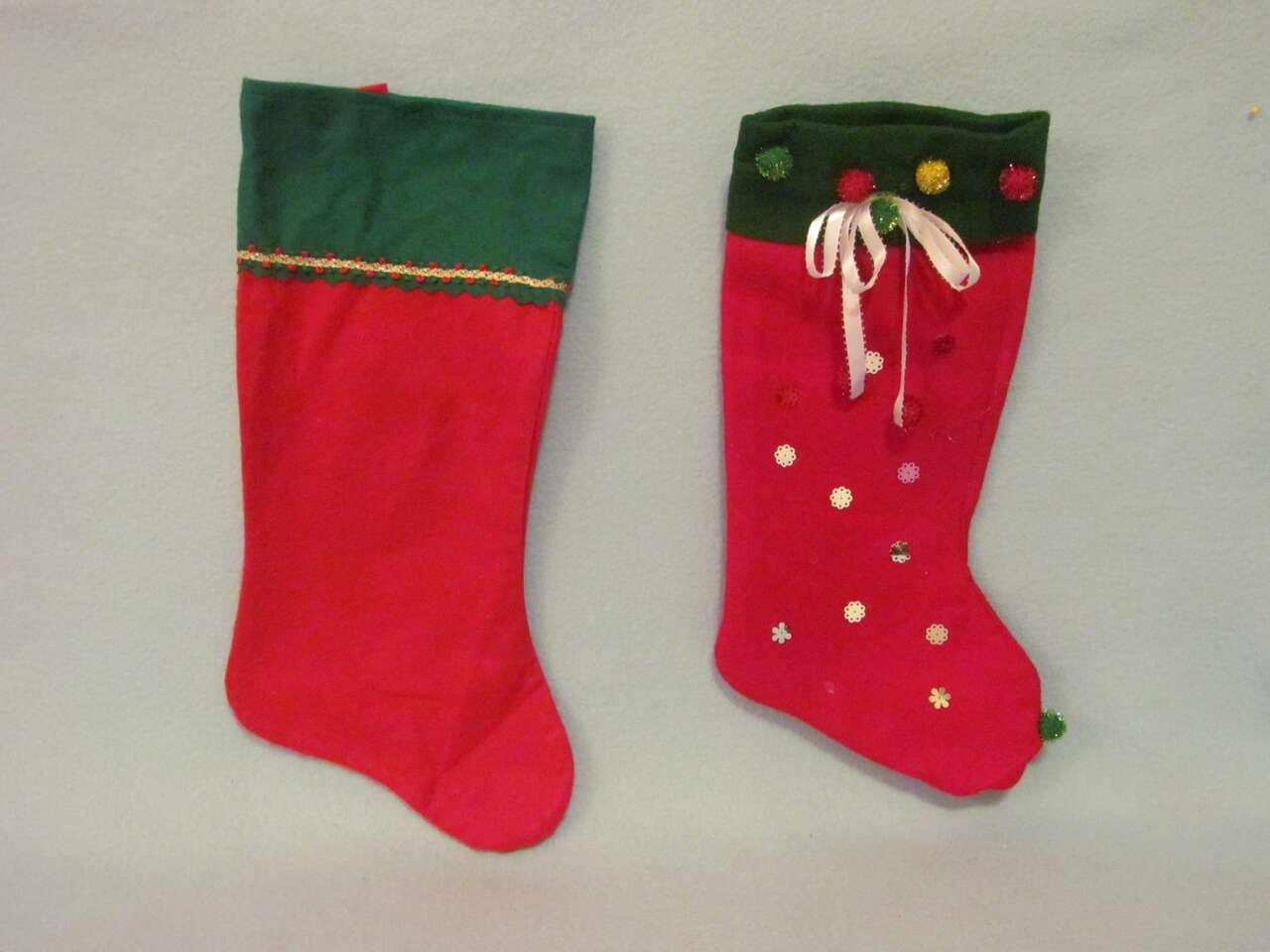 $5 Set of 2 - Green & Red Stockings - Excellent preowned condition other than a couple of the decals have fell off the one stocking with a bow.