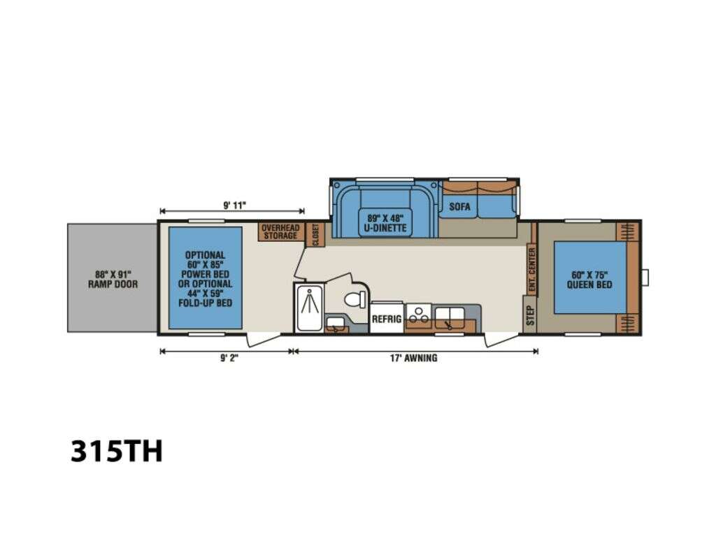**Features may include:**3/8" Fully Walk On Roof w/SuperFlex Roofing Material 5/8" Tongue & Groove Plywood Floor 3 Burner Cooktop 5 Cubic Foot Refrigerator 6 Gallon Gas DSI Water Heater 8 Tie Down Rings 20# Gas Bottles 30 Amp Service 13,500 BTU AC Acrylic Sink AM/FM/CD Player Awning w/Drip Rail & Spouts Built-In Medicine Cabinet w/Mirror in Bathroom Cable Hook Up Designer Match Box Style Valances Enclosed Pin Box on Fifth Wheel Enclosed Underbelly (N/A on 229TH & 265TH) Extra Large Baggage Doors Heated Underbelly High Rise Faucet Large Overhead Cabinets LED Interior Lighting LED Light in Pass Thru Storage Microwave w/Turntable Mini Blinds Monitor Panel Patio Door Light Power Vent in Bathroom Queen Mattress Radius Entry Door Radius Truss Rafters Range Hood w/12V Light & Exhaust Fan Roller Ball Bearing Drawer Guides Self-Adjust Brakes Sink Cover Smooth Screwless Baggage Doors Solid Wood Framed Mortise & Tenon Cabinet Doors Tinted Safety Glass Windows Tub Surround Tuff Ply in Cargo Area (N/A on 229TH & 265TH) TV Antenna w/Booster
