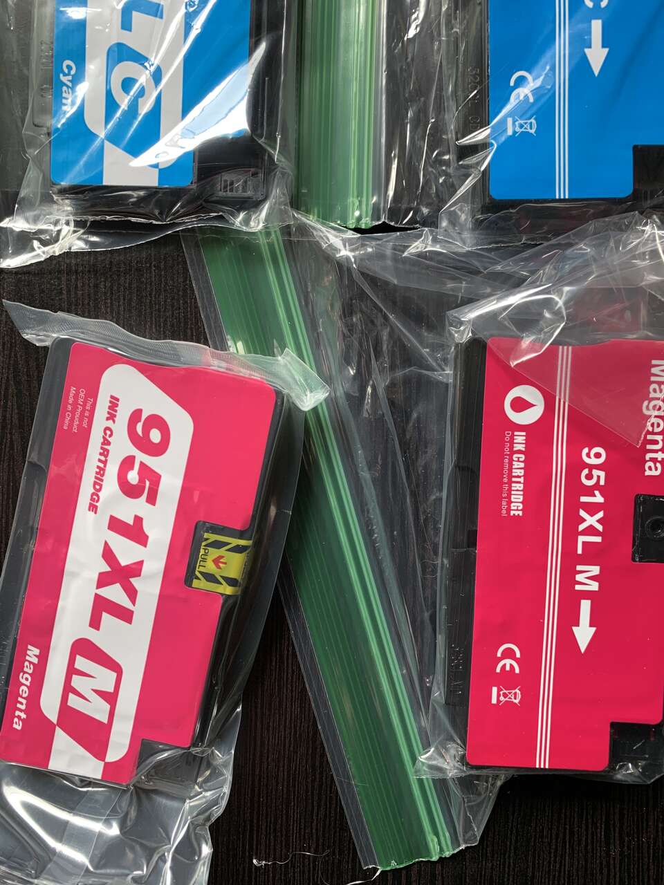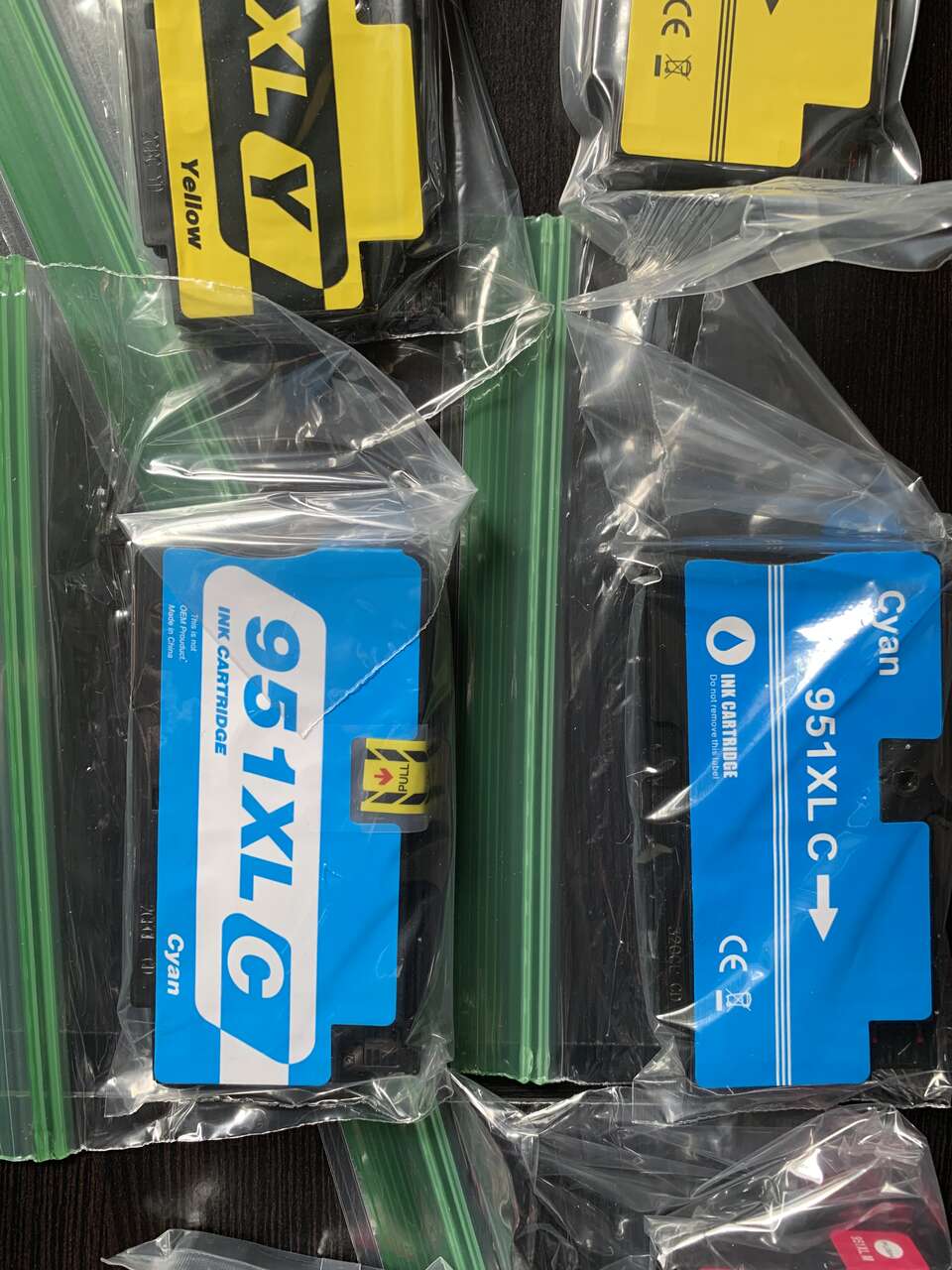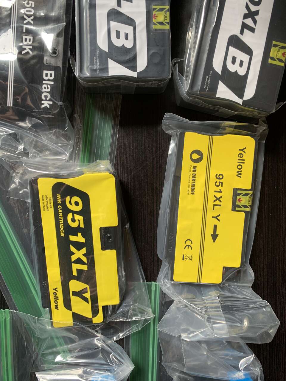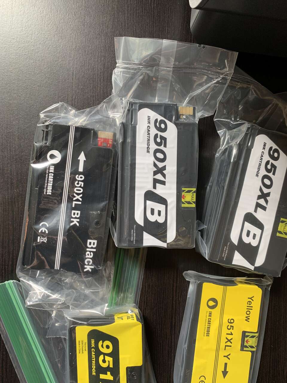 Two unopened 950XL, one opened - black. Two each, yellow, cyan and magenta cartridges.
