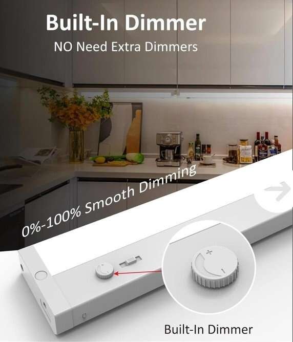 VenmoDimmable Under cabinet lights:Built-in Dimmer Under cabinet lights no need in-wall dimmers. Brightness can be changed smoothly by the knob on the under counter light 0% to 100% dimming range 5 Color Temperature(CCT) Settable: You can select a Soft White (2700K) Warm white (3000k) Neutral Bright White (3500k) Cool White (4000K) or Daylight (5000K). And with an On/Off Switch ideal for under cabinet lights counter light
