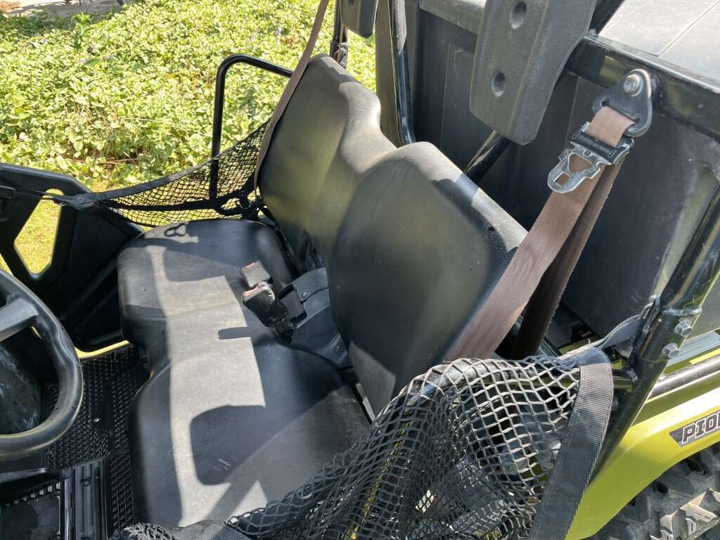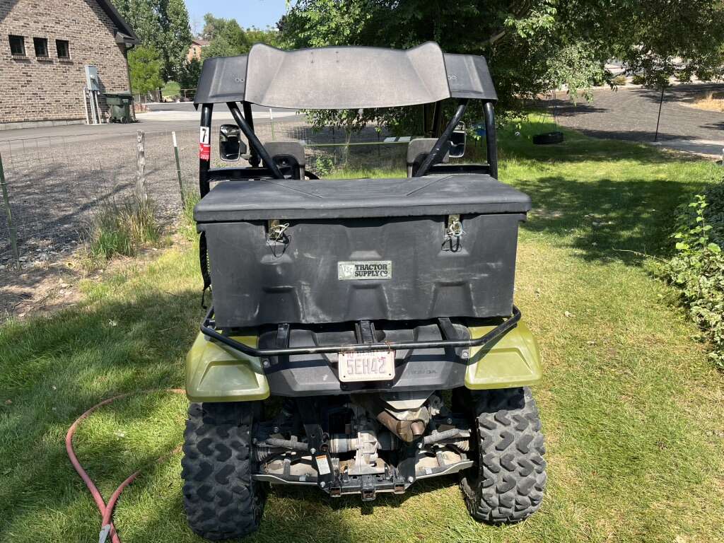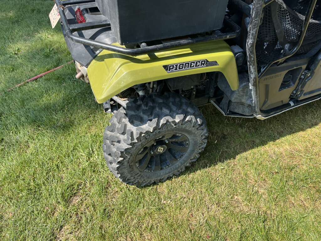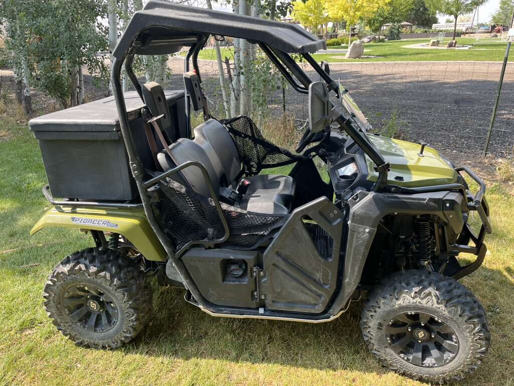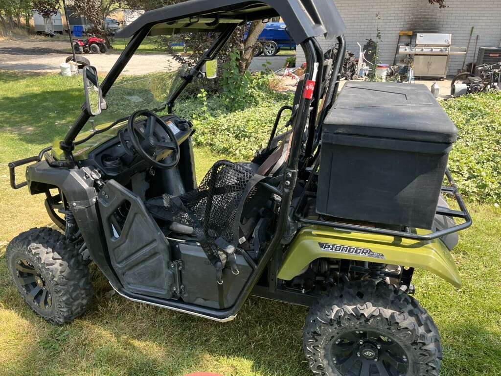 Great running pioneer with new wheels and tires. Switch between automatic and manual shift with the turn of a switch. Comes with a cargo box on the back, a half windshield, and roof. Goes anywhere and fits on all the small atv trails.