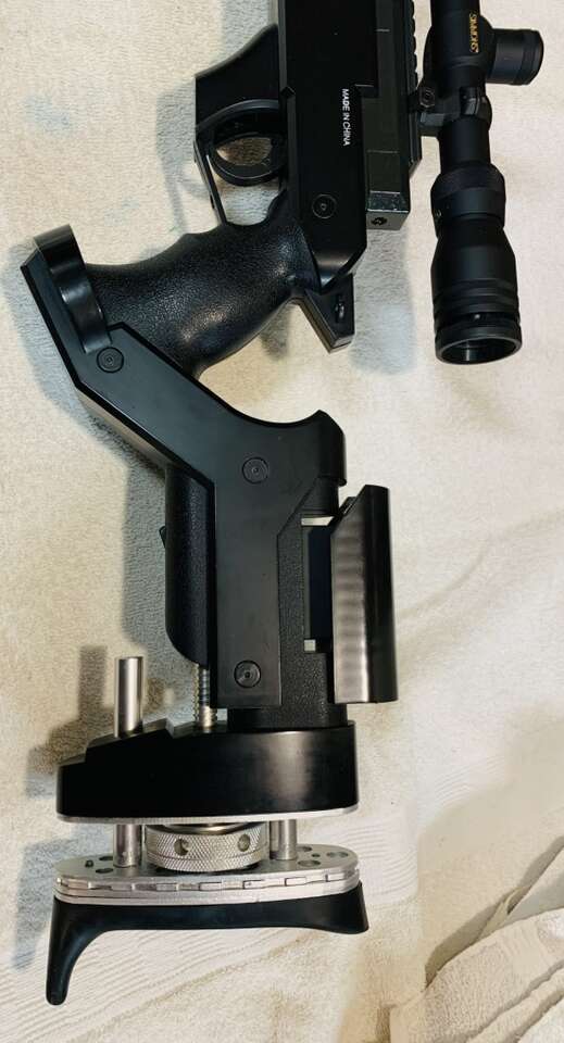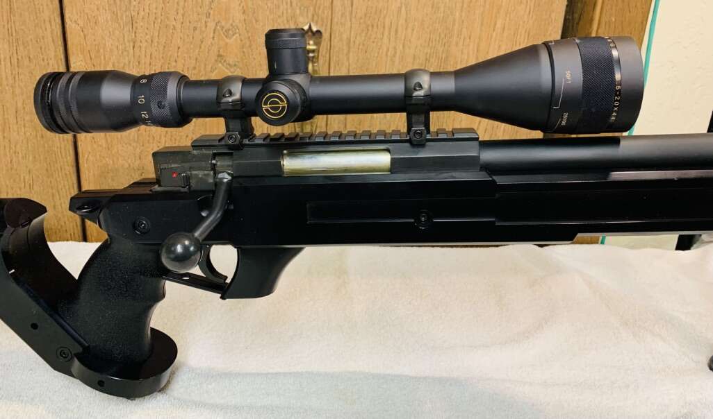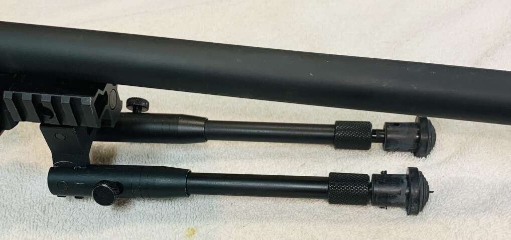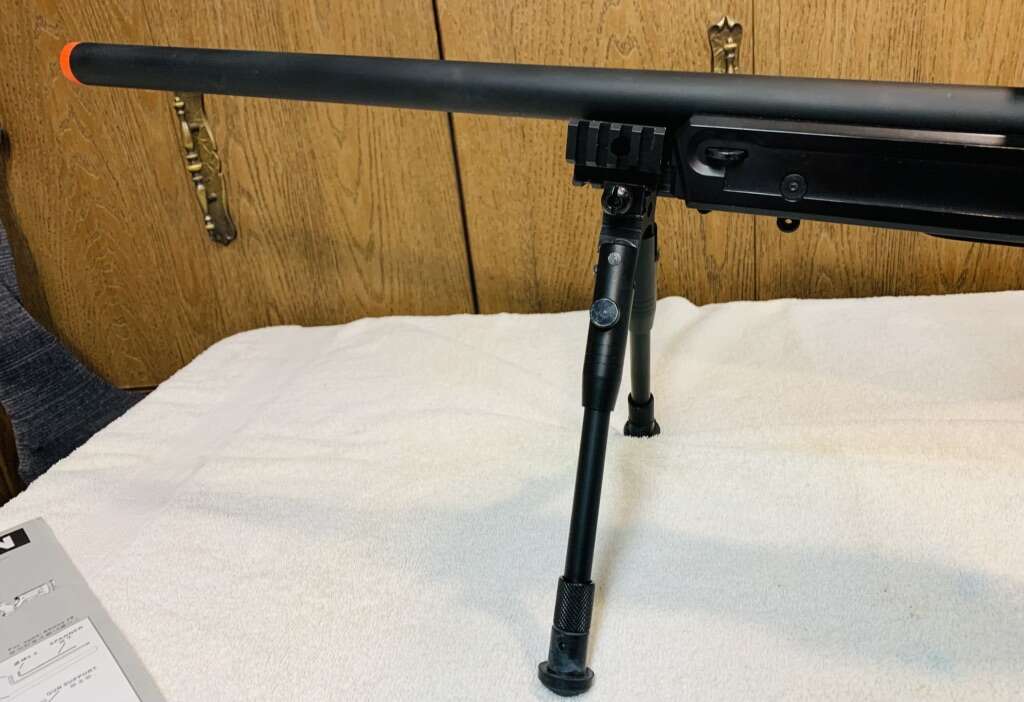 Bolt Action Sniper Rifle with mounted Scope. Simmons 6.5-20 c 44mm Target Scope with Adjustable Objective (10 yds to Infinity). Condition: Very Good. Adjustable Cheek Rest & Stock Length. Removable, Height Adjustable Bi-Pod. 23 Shot Metal/Plastic Magazines. Rifle Construction is a combination of Metal & Plastic. Up-graded Power Source is a Spring Piston cocked by the Bolt Action & released by the Trigger pull. Average Velocities: 465 fps with 0.20g BB’s. 425 fps with 0.28g BB’s. 310 fps with 0.43g BB’s. Manual Safety. Rifle Weight is 8.5lbs. Barrel Length is 24” Rifle Length is 48”+- Hop-Up Adjustable.