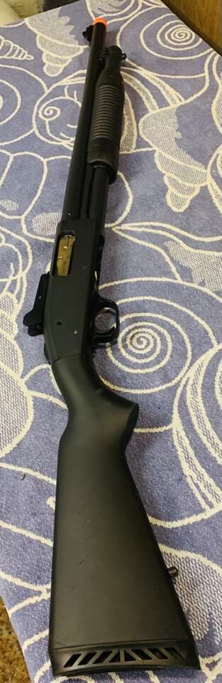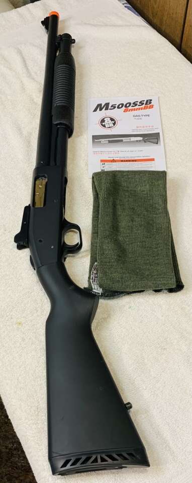 GasPump Shotgun Made in China. Condition: Excellent. Full Size & Weight (7 lbs). Ramp Post Sight & guarded Peep Rear. Tubular Magazine holds 40+ BB’s. Manual Thumb Operated Safety. Manual Includes a complete Parts Diagram. Construction is Metal & High Quality Polypropylene. The (3) Feeding Tubes & 17” long Smooth Bore Inner Barrel are Brass. Overall Length 38” with an 19” Outer Barrel. Satin Black finish. Very Smooth Authentic Mossberg Replicated Pump & Moving Bolt Actions. Feels like the Real Thing. 3 BB’s in each Shot.
