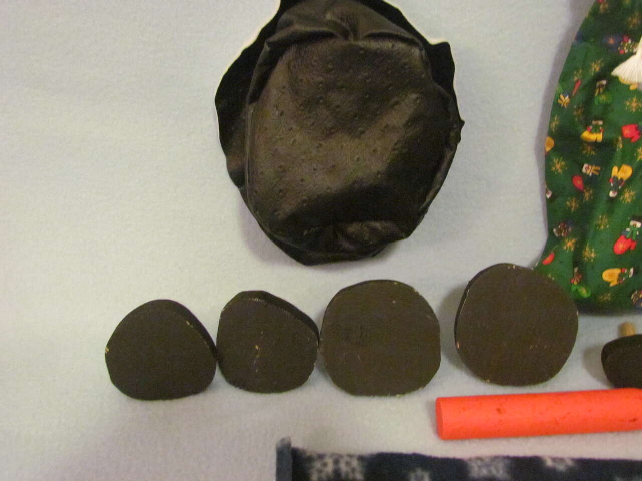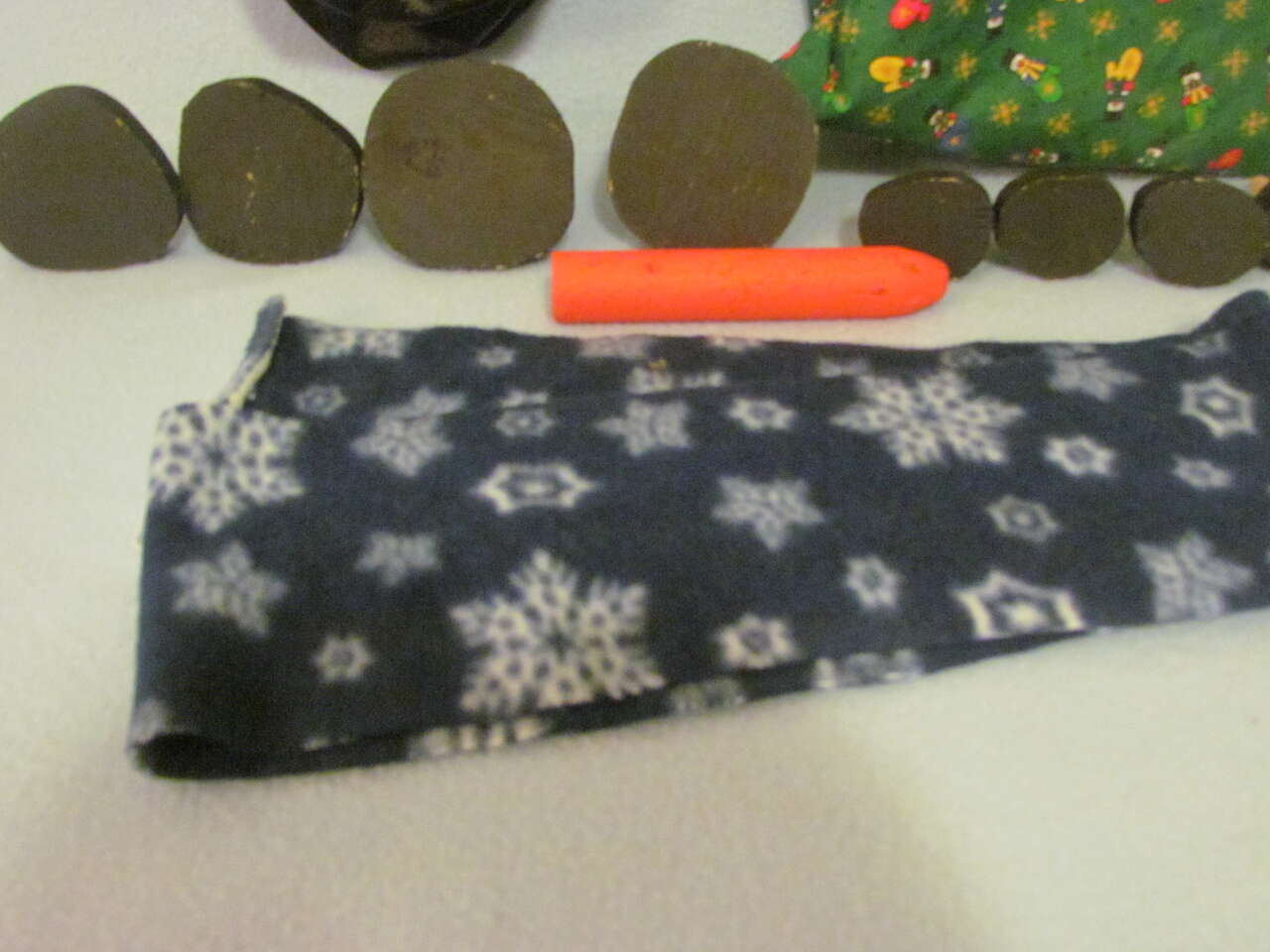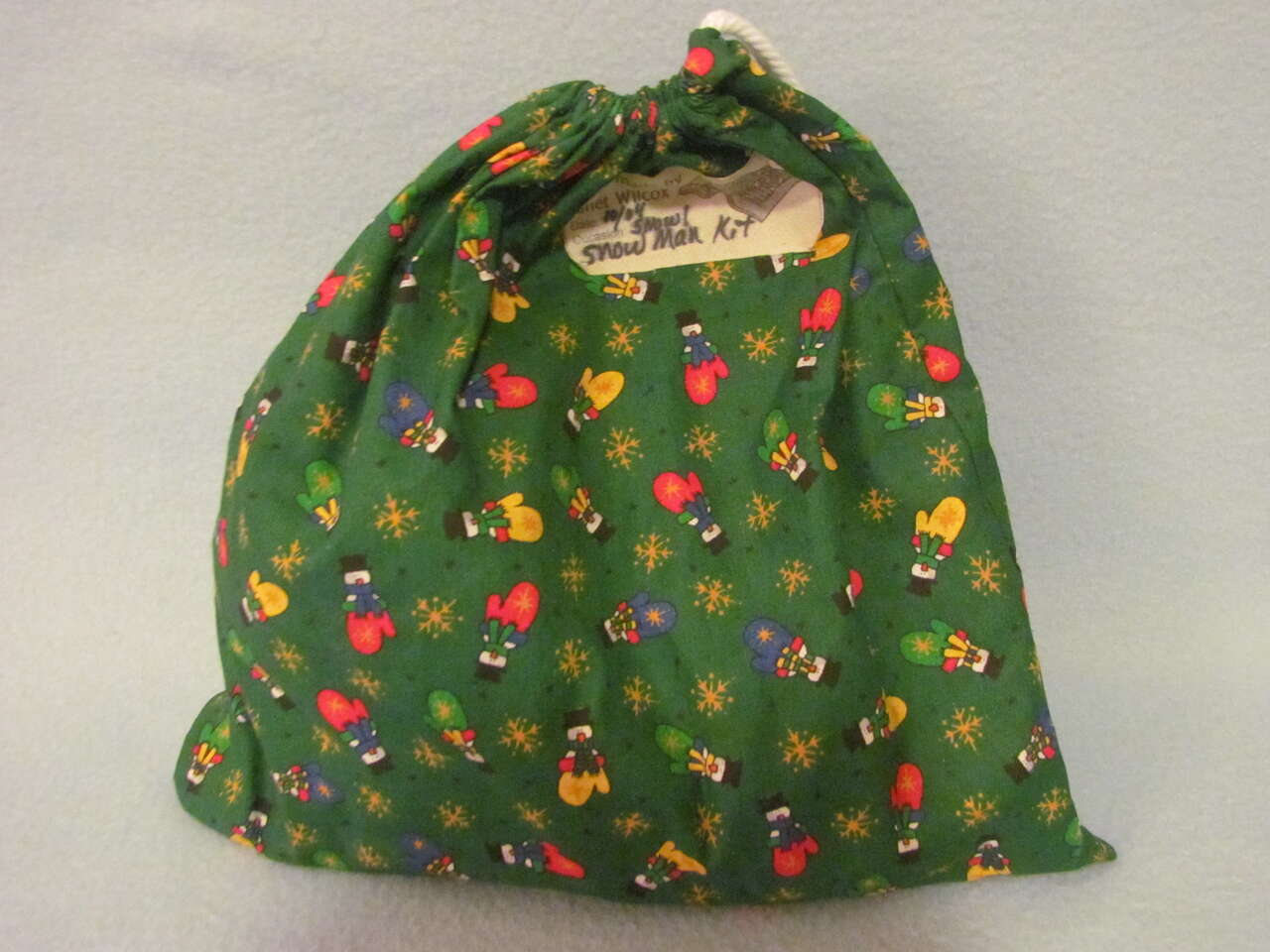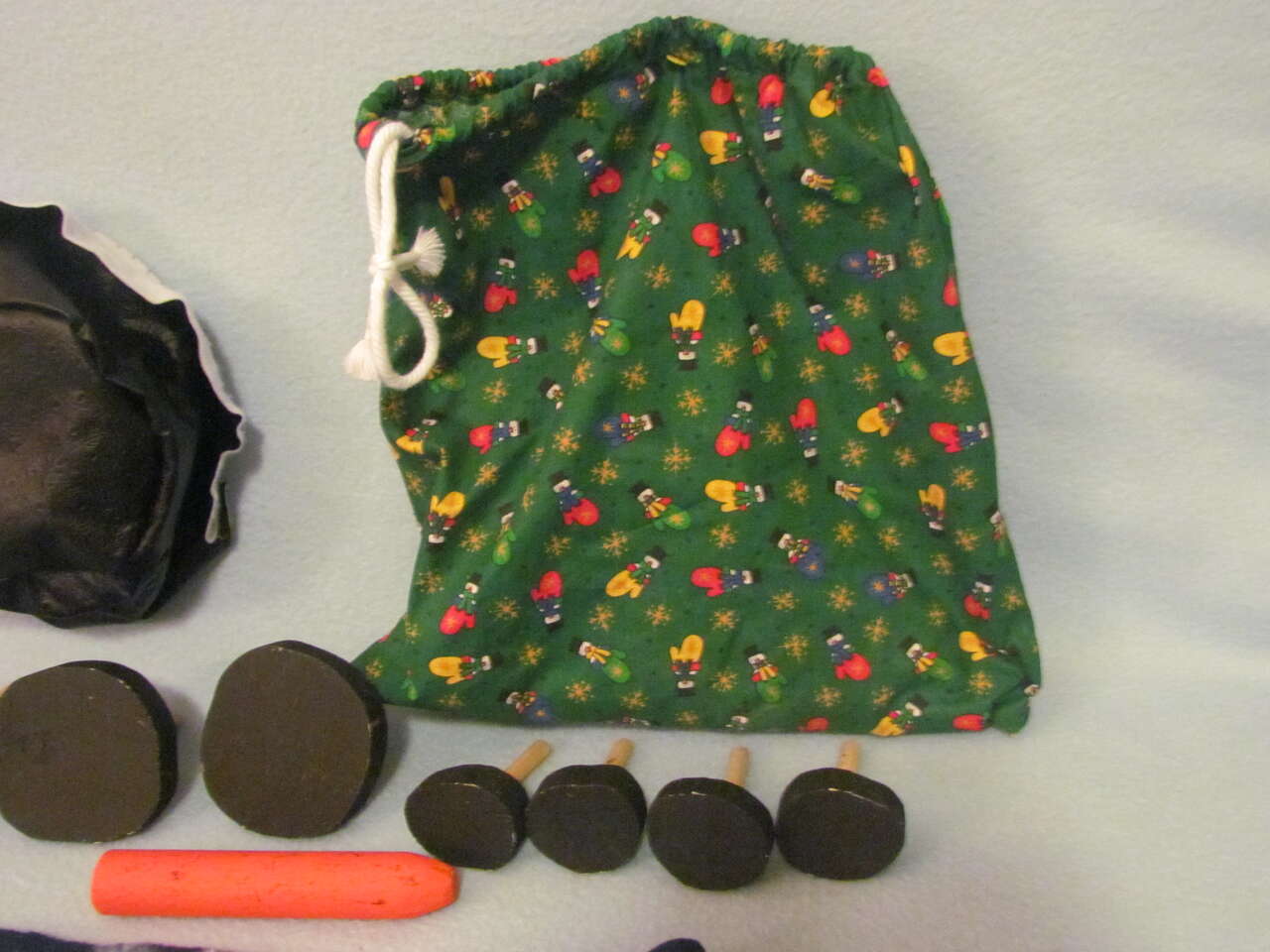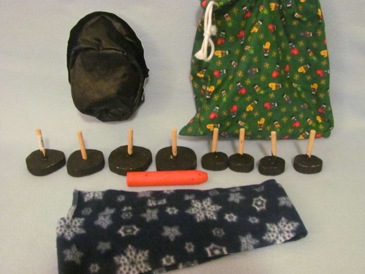 This snowman kit will provide lots of fun to your kids when they're making snow men. There's 4 small wood "coal" pieces for the mouth, 2 medium size for eyes, and 2 large size for buttons. Then there's a "carrot" nose piece with a black hat, fleece scarf, and drawstring bag to keep them all in when not in use. Good preowned condition.