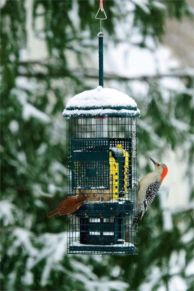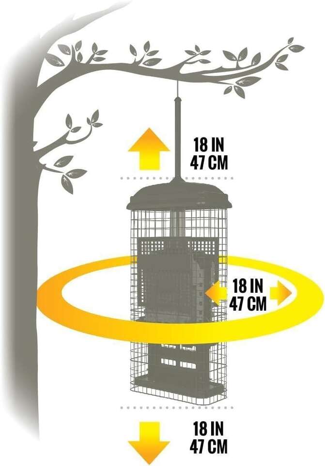 SQUIRREL-PROOF: Openings in the shroud align with the feeding ports, providing birds access to the food. When a squirrel climbs onto the feeder, its weight automatically forces the shroud down, closing access to the ports. Squirrels and some large birds are foiled but not harmed in any way