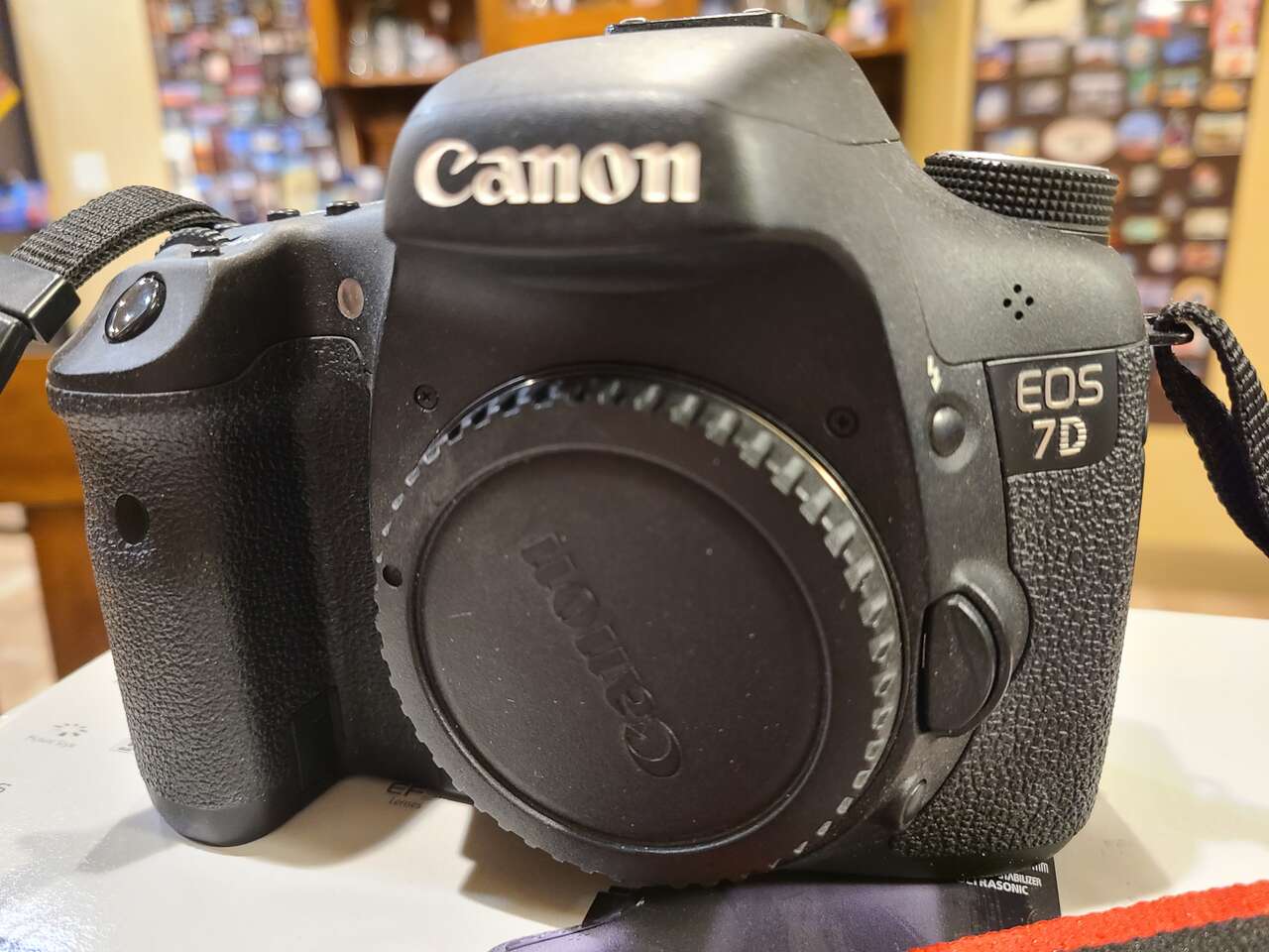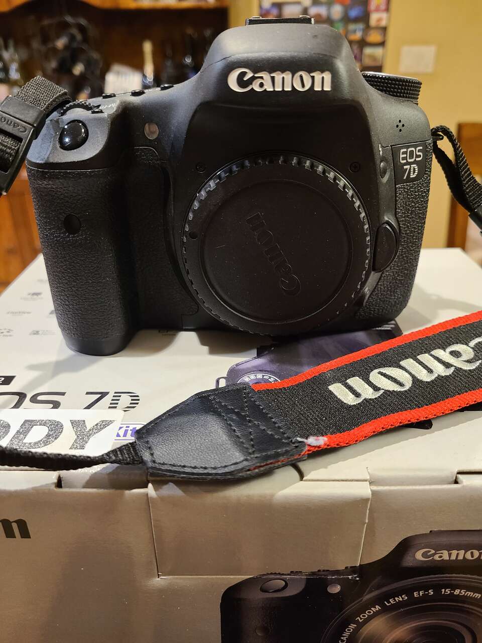 PayPalCanon EOS 7D in the box. No damage, works perfectly. I'm selling because I upgraded to a full frame camera. Comes with camera, camera strap, 6 used and functional batteries, battery charger, EFS 18-55mm lens and EFS 55-250mm lens, wireless remote, and small flexible tripod. Located in St George.