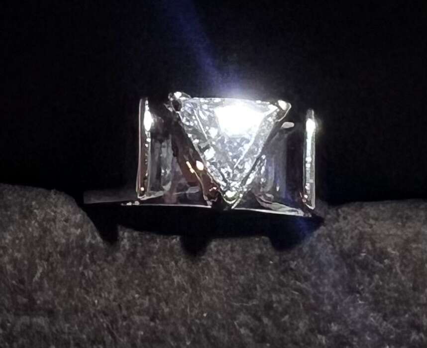 VenmoBeautiful REAL, (NOT Cultured), Diamond Engagement Ring. Very nice cut, color and clarity, pics just don’t do it justice. Cut: Trillion (Very Rare) Color: F (Colorless) Clarity: SI1 (One single Inclusion, only visible under 10x magnification) Carat: .77ct Setting is 14ct gold and is Rhodium plated. Setting is currently size 6 and is still adjustable, ring currently has tabs that keep it from spinning and can be removed to accommodate a larger finger.