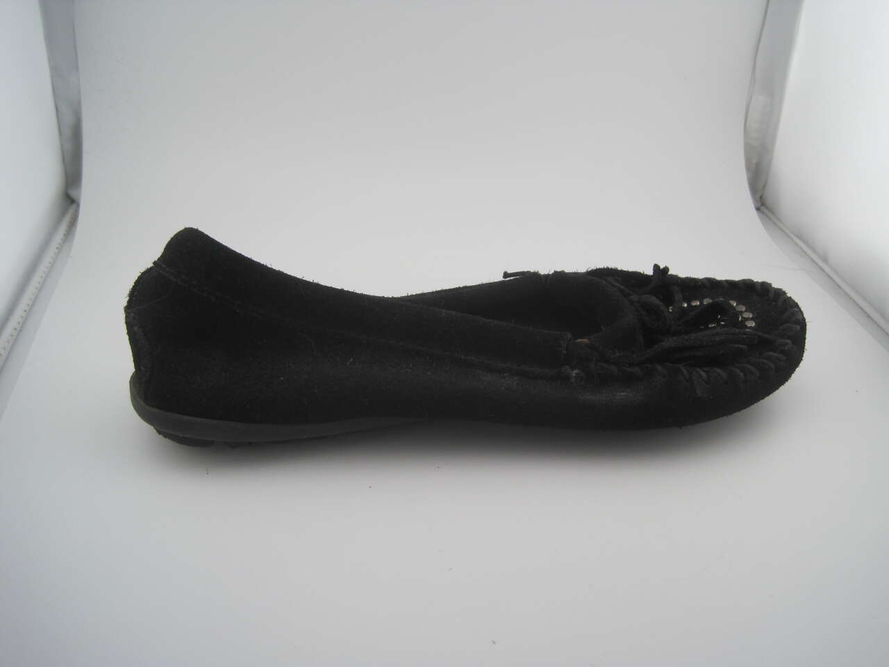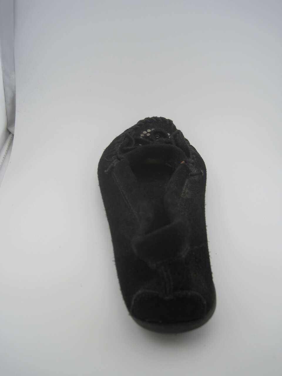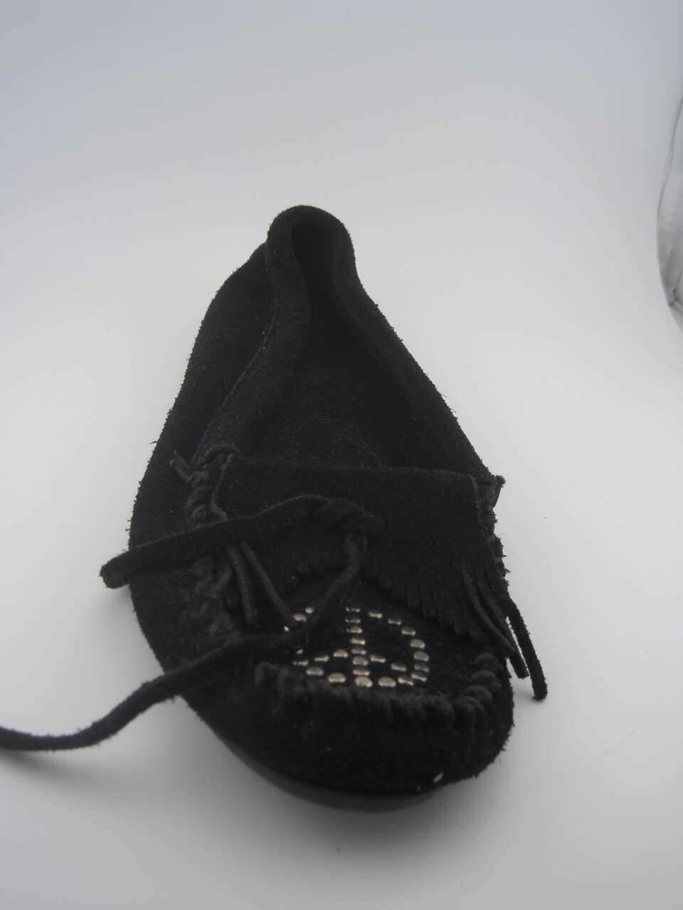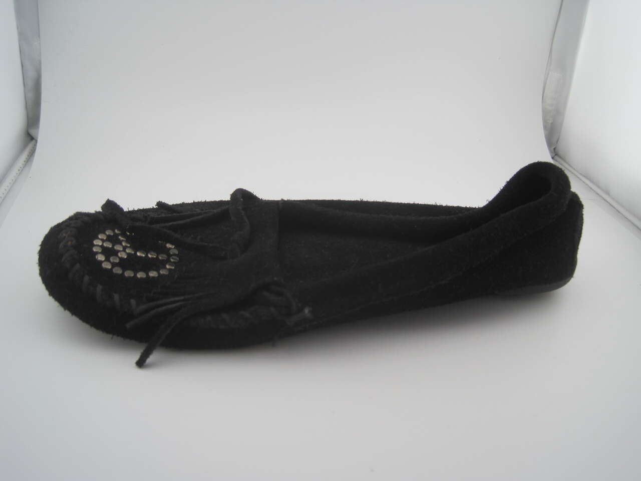 Elevate your shoe game with these stylish Minnetonka moccasins. Crafted from high-quality leather, these shoes feature a round toe and slip-on closure for easy wear. The black suede fabric is accented with lace, fringe, studs, bow, and logo details, making them perfect for any occasion, from parties to casual outings. These women's shoes are designed with a standard shoe width and a 7.5 US shoe size. The peace sign design is a must-have for those who love the boho theme. These shoes are perfect for all seasons, including winter, summer, fall, and spring. The Dominican Republic is the home of these beautiful moccasins, which are sure to add a touch of elegance to any outfit.