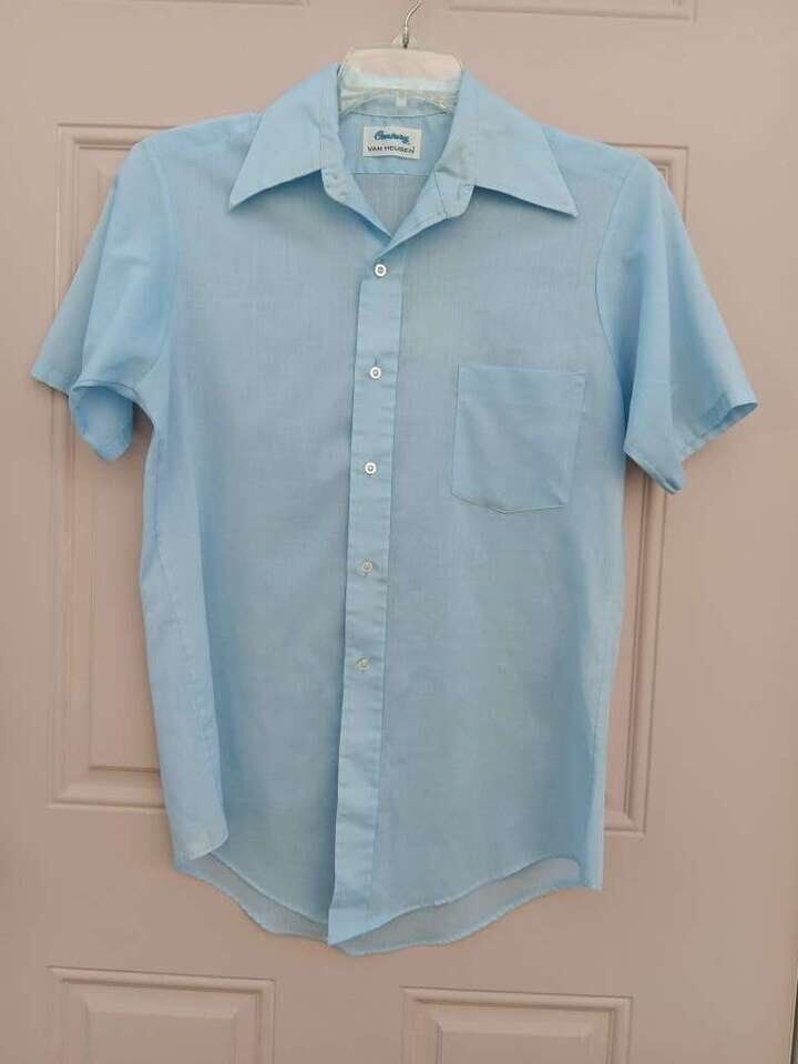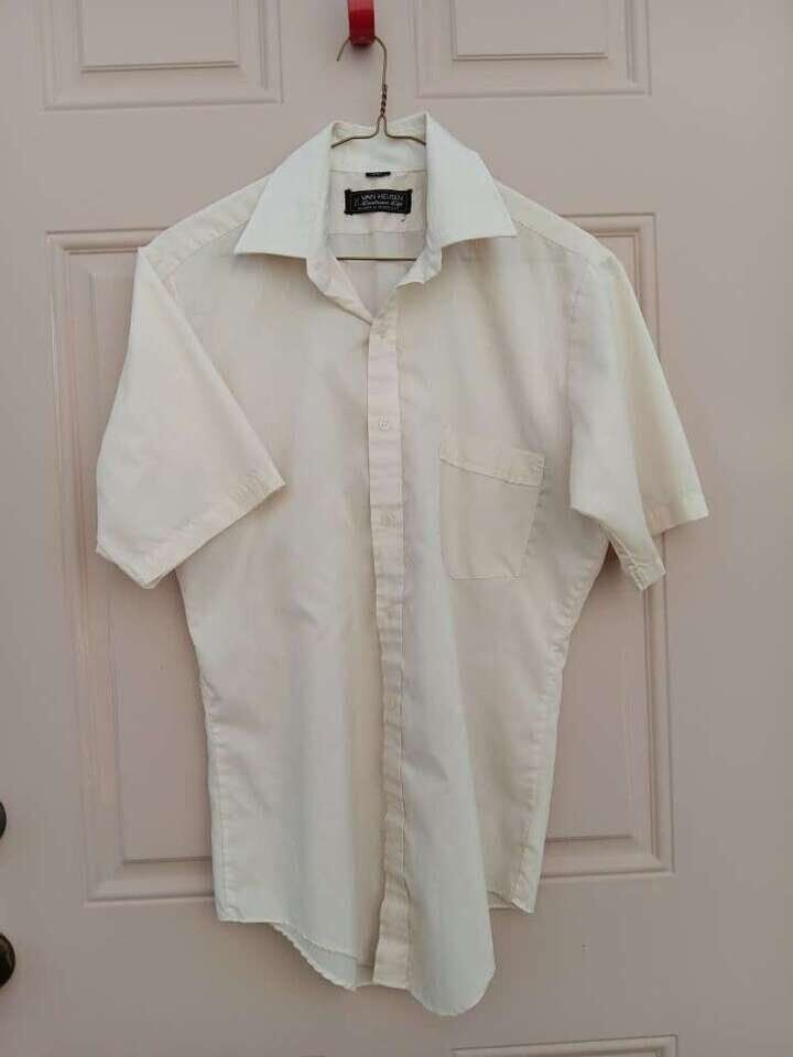 *Light Blue, Van Huesen $3, size unknown *Off-white cream, Van Huesen $3, size 15 *Green plaid, Van Huesen $3, size 14-33 (my dad wore this for Christmas & St Patrick's day :) *White, Utah Woolen Mill $3, size 15/16, the tag in the pic shows $7, but it's really only $3 *New Blue Stripe, Estate brand $10 size M-M 15 1/2-16 NEW, still tagged