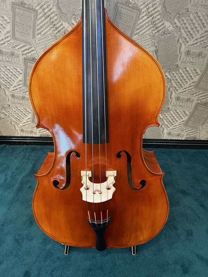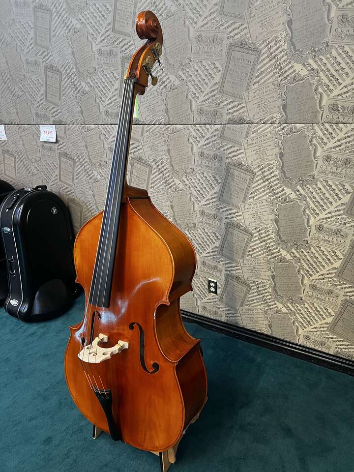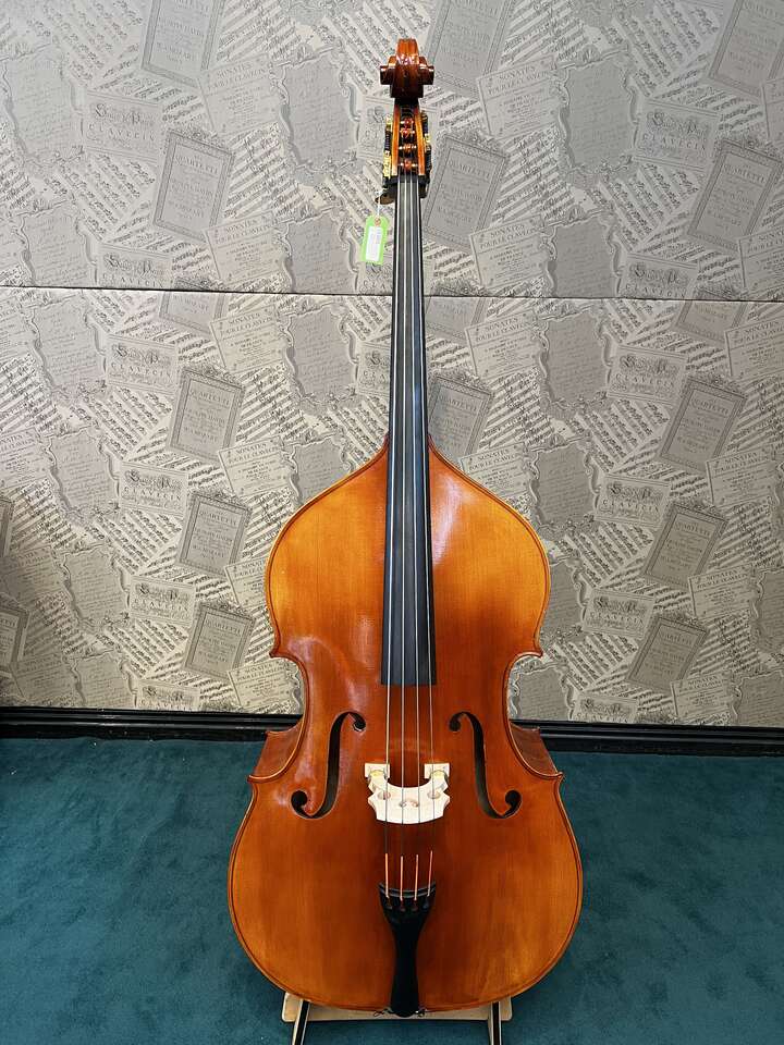 "The Panetto Strings String Bass Model 130 is a beautifully crafted double bass designed for both students and advancing players. Featuring a solid spruce top, maple back and laminate sides for stablility, this instrument offers a warm, rich tone with excellent projection and clarity. The Model 130 is designed with a comfortable neck and fingerboard, making it easy to play for extended periods. Its traditional design and craftsmanship ensure durability, making it suitable for various musical styles, from classical to jazz. This double bass is an excellent choice for musicians looking to develop their skills and sound.