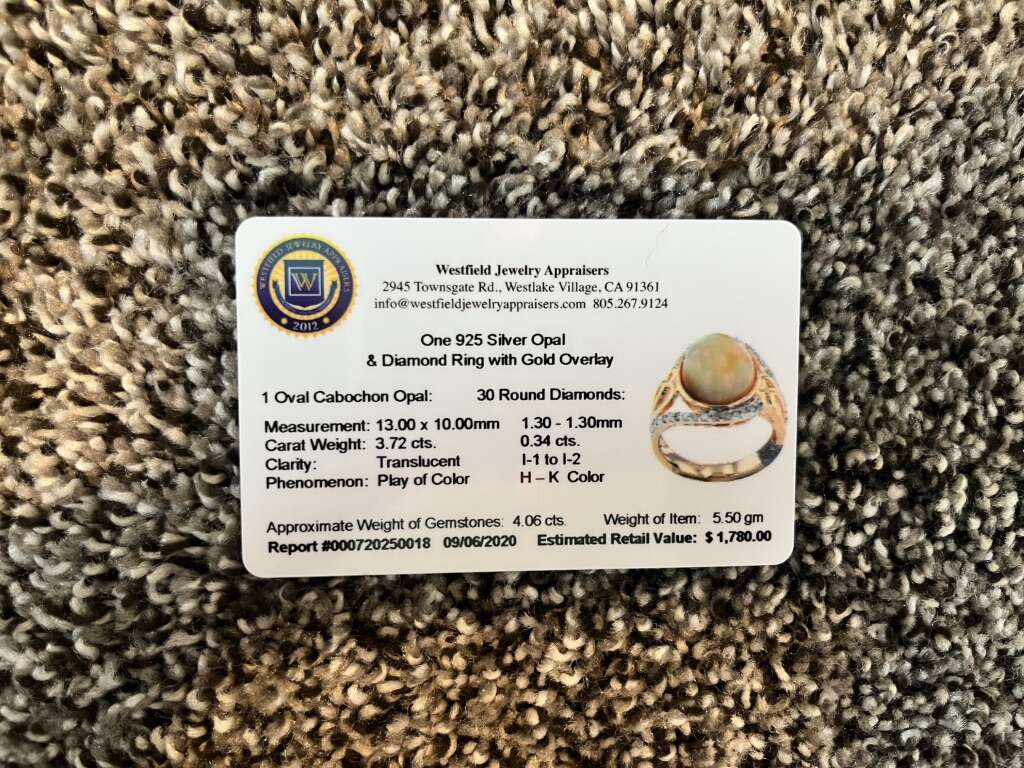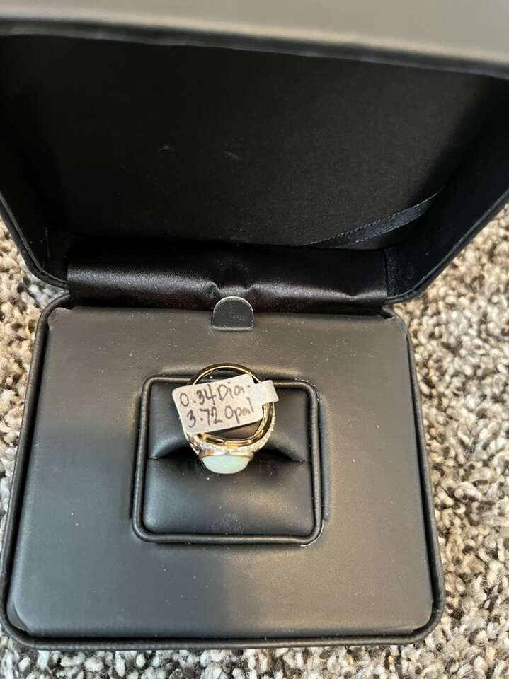 VenmoBrand new (never been worn) beautiful Opal & Diamond Ring with Gold Overlay. The opal is 1/2” tall by 3/8” wide. It has 30 small round diamonds above and below it. Approx weight of the gemstones is 4.06 cts. It really is a beautiful ring! Includes an appraisal showing an estimated retail value of $1,780. I’m asking just $499. It would make a wonderful gift for your spouse or significant other for a birthday, anniversary or other special occasion.
