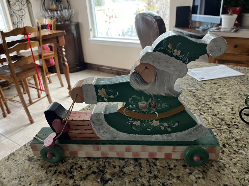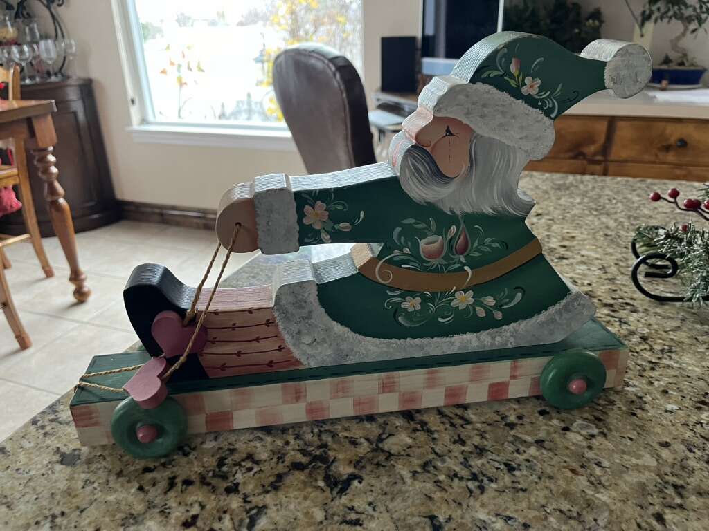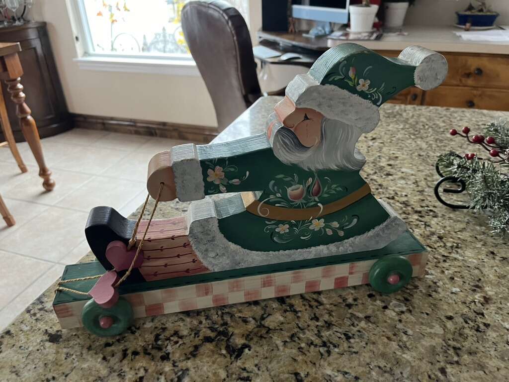 Santa Bavarian painted by Hella Pope pulling on wheels 16” L 10” tall
