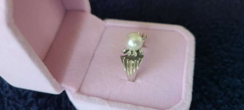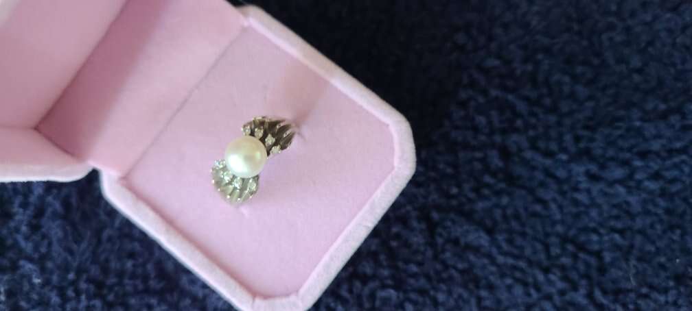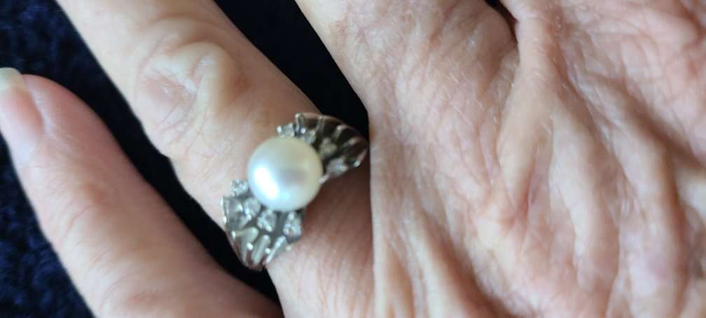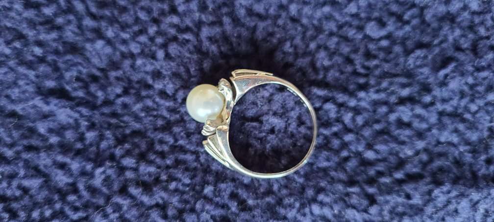 Real pearl in center. 3 small man made diamonds on each side of pearl. 7-8 mm pearl. Sterling silver setting. size 7.25