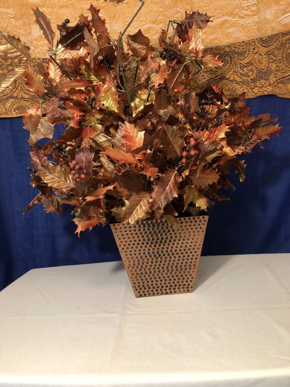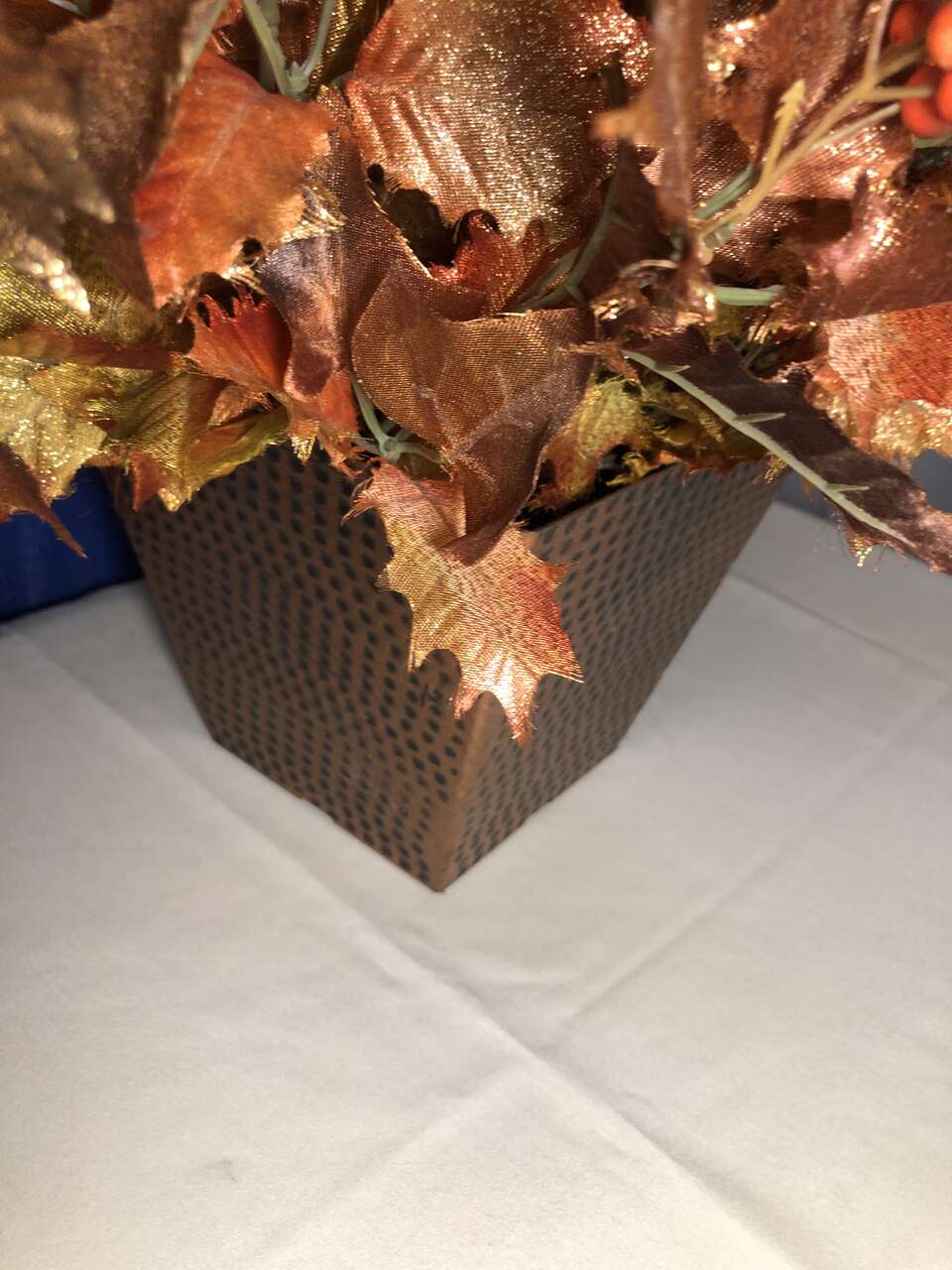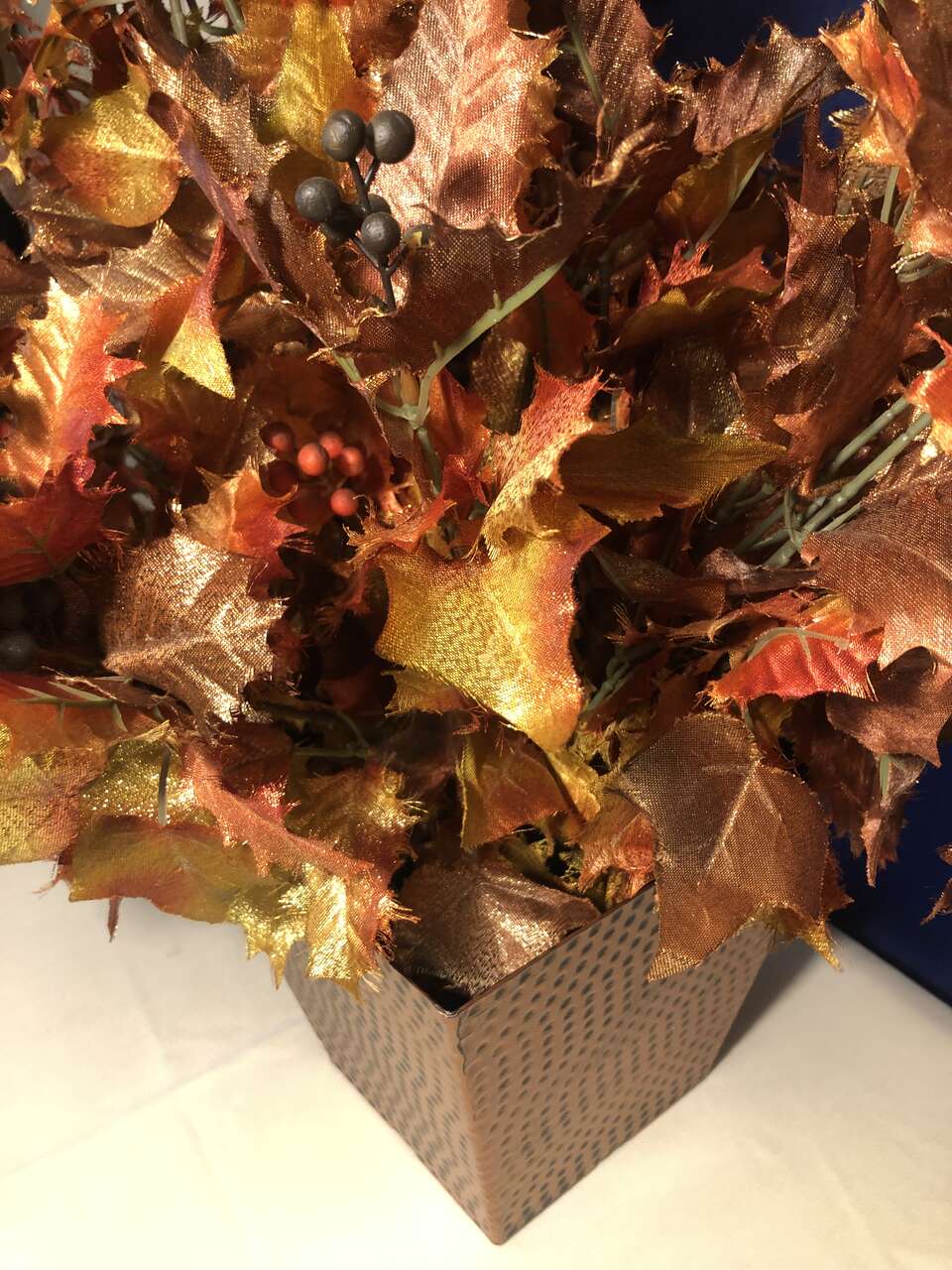 VenmoThe pictures do not do this justice. It is gorgeous with sparkly golds, oranges, and yellows make up the lovely faux leaves. It has a foam insert filling the bottom portion of the plastic planter to hold the leaves in place. It is very lightweight, so easy to store and move as needed. The added wear of the copper paint of the planter gives this piece an elegant accent. The entire piece is 25 tall, 15 wide. The planter base is 6 3/4 tall, 5 wide at the base and 7.5 wide at the top.
