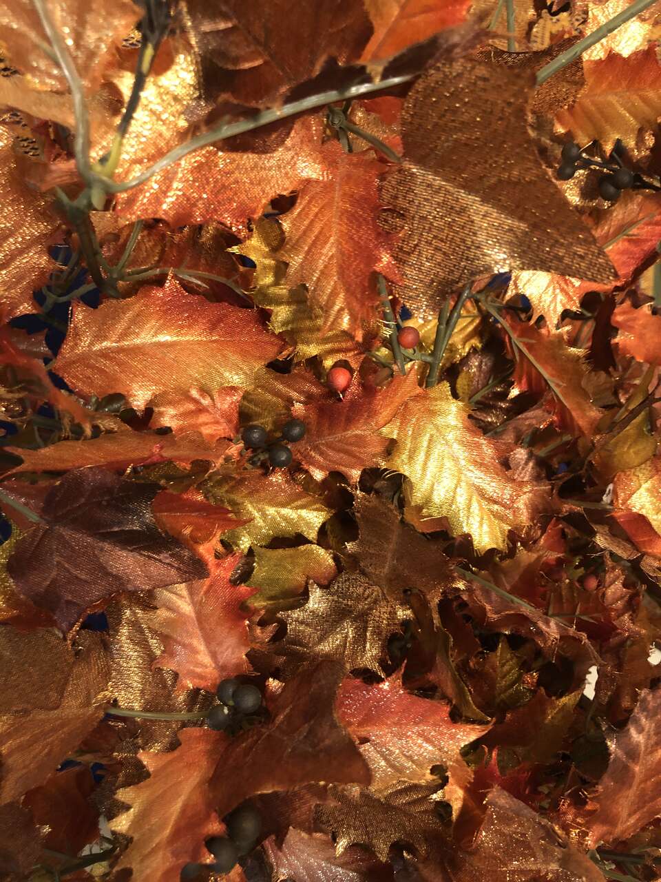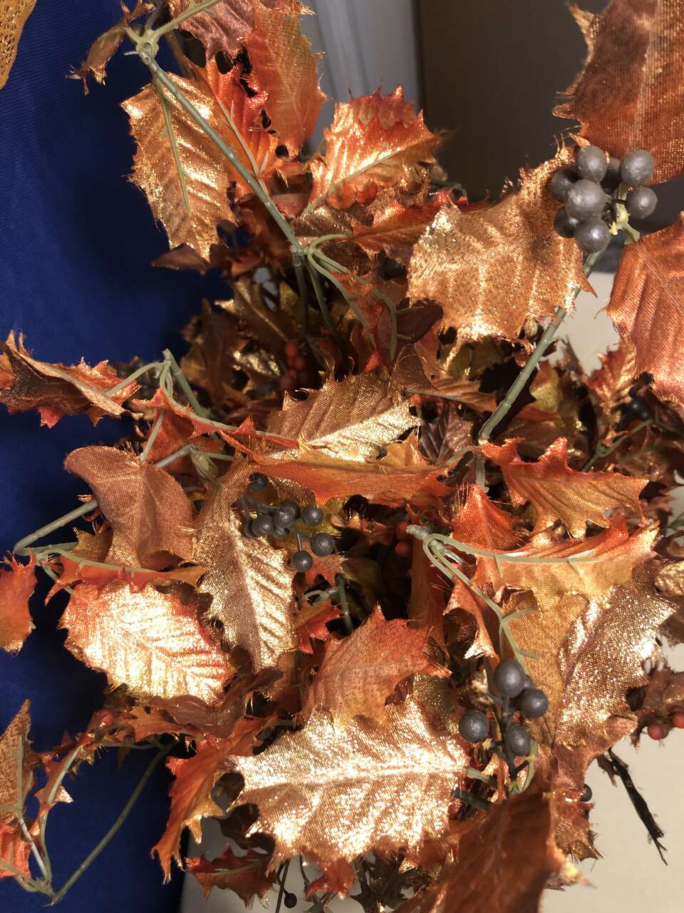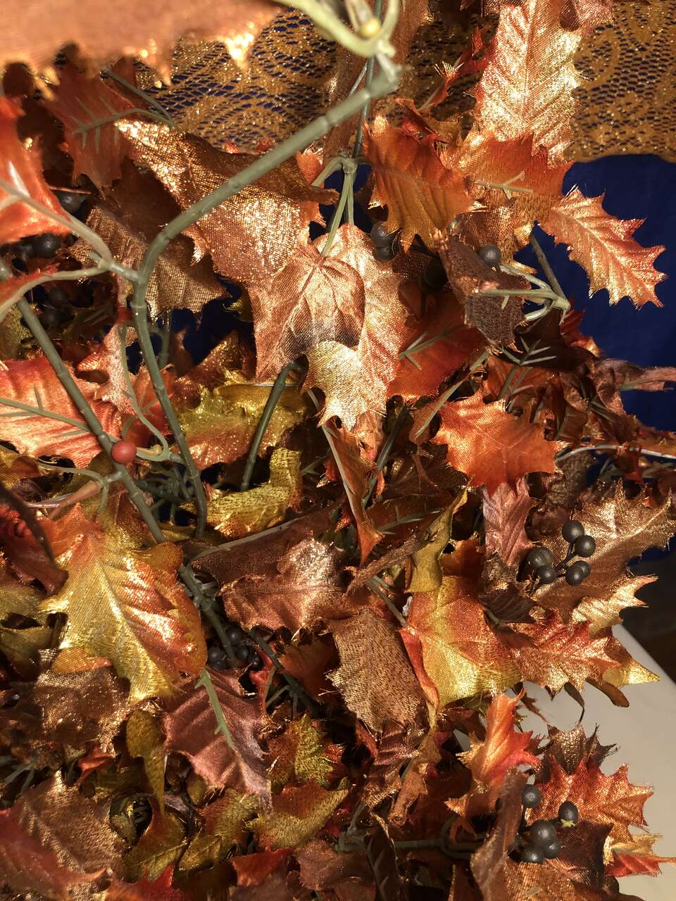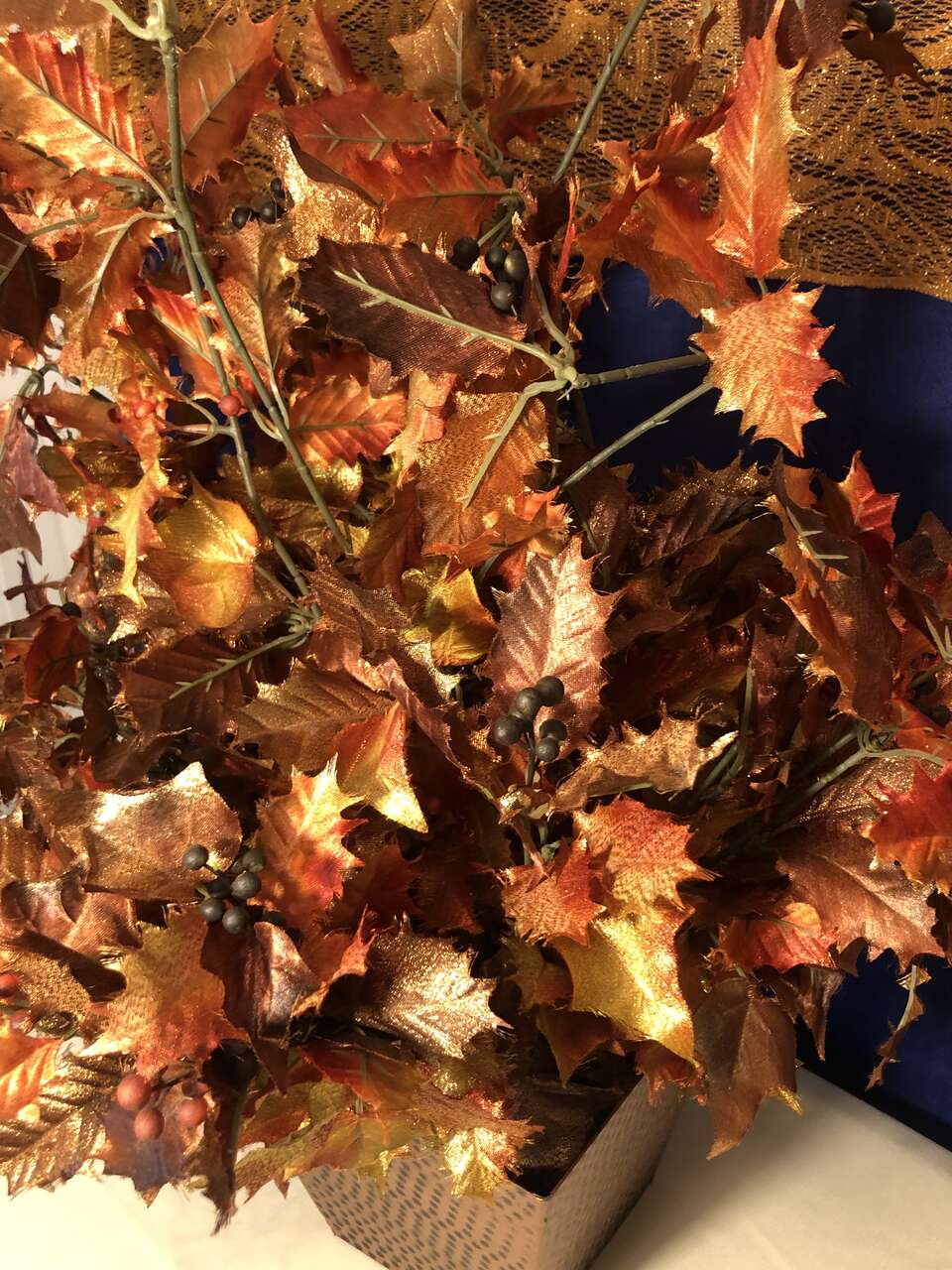 VenmoThe pictures do not do this justice. It is gorgeous with sparkly golds, oranges, and yellows make up the lovely faux leaves. It has a foam insert filling the bottom portion of the plastic planter to hold the leaves in place. It is very lightweight, so easy to store and move as needed. The added wear of the copper paint of the planter gives this piece an elegant accent. The entire piece is 25 tall, 15 wide. The planter base is 6 3/4 tall, 5 wide at the base and 7.5 wide at the top.