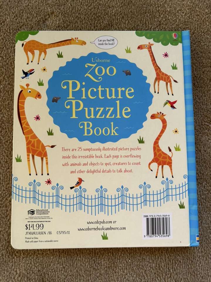 Usborne Zoo Picture Puzzle Book. 25 beautifully illustrated picture puzzles full of animals and objects to spot, count, and discuss. Oversized hardback in very good condition. Text only. Cash or Venmo.