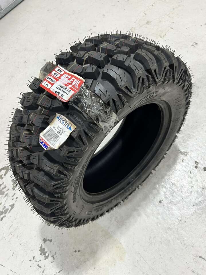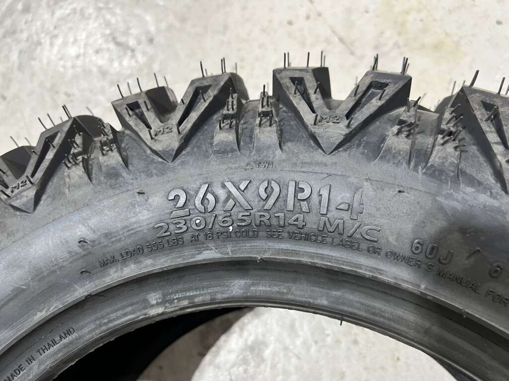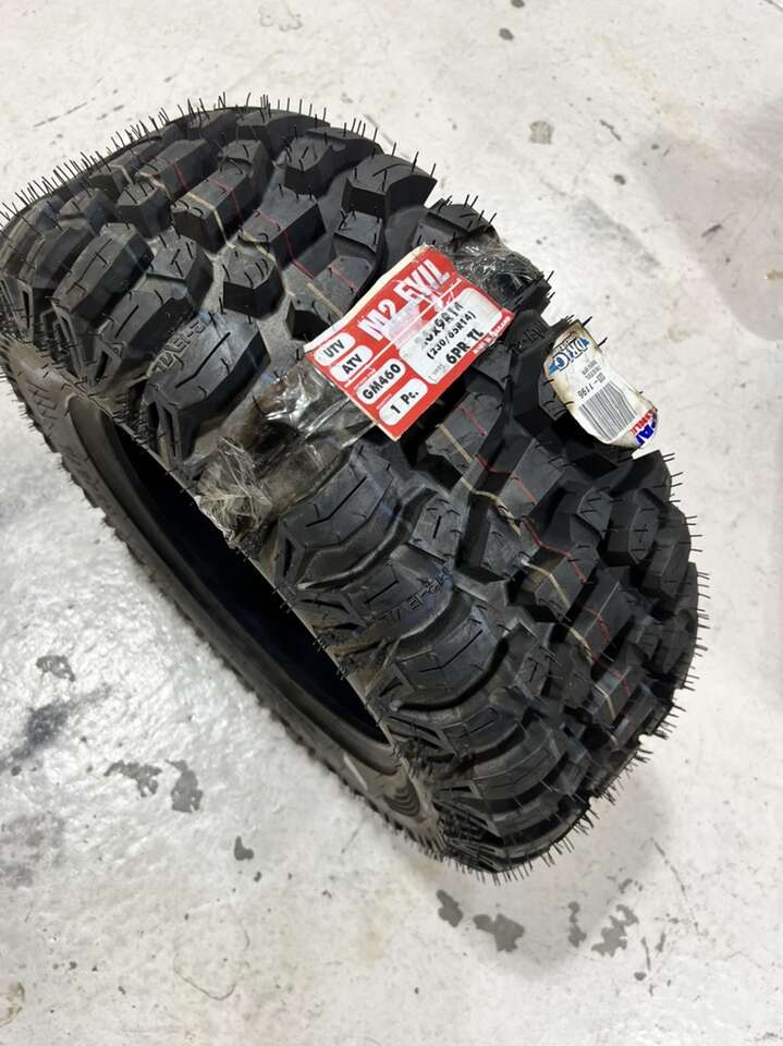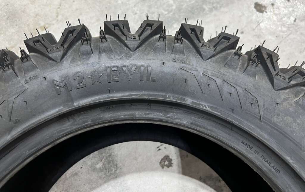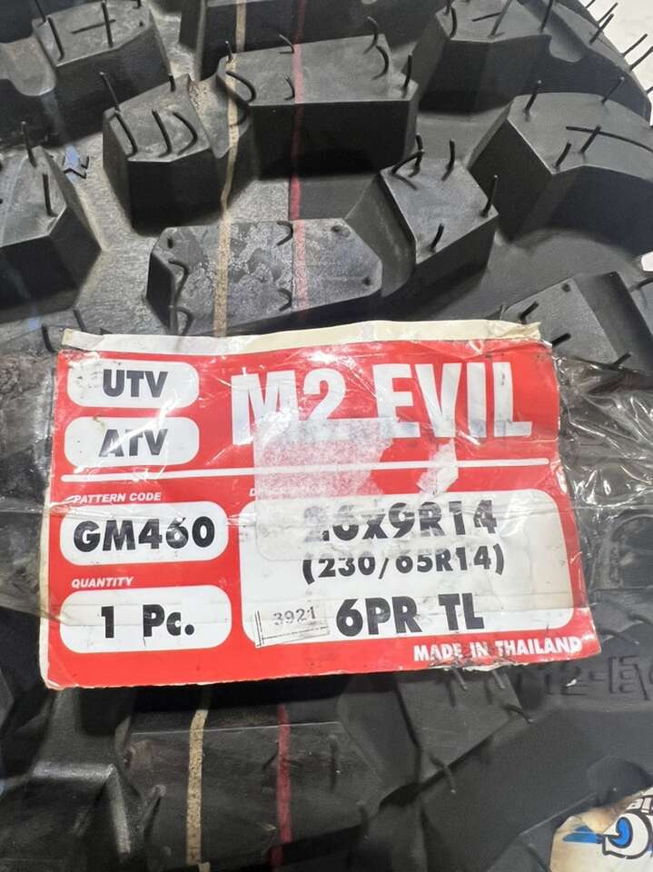 Zelle26x9R-14 M2 Evil ATV / UTV Tire 6 ply Tread Depth 0.79 Weight 29.7 lbs Retail $178.95 The strong shoulder and sidewall tread add protection and traction in sand, dirt and rocks Smooth ride with a special long-lasting natural rubber compound for superior tread life Offers lighter weight, superior handling and exceptional ride performance Truck-like non-directional tread pattern provides smooth ride 20mm tread depth Tubeless (TL) Radial Not certified for use on public roads (NHS)