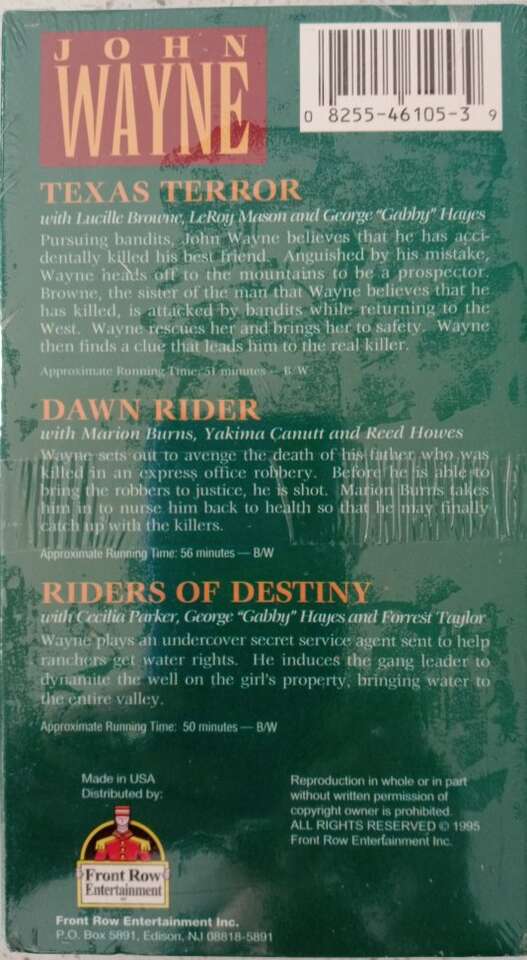 Includes Texas Terror, Dawn Rider, Riders of Destiny. Approx. Running Time: 157 minutes. VHS Movies $5.00 Cash Only In West Valley
