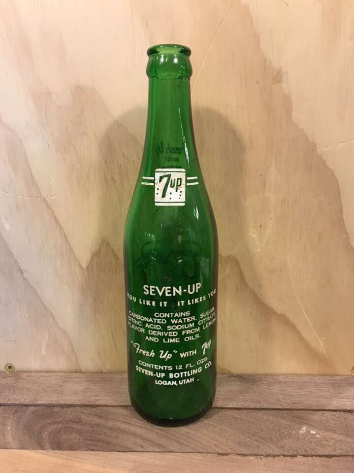 7-UP Soda Bottle $12 Vintage 1958 Fresh up with 7-up You Like it, It likes you Logan, Utah Bottling Applied Color Label Good condition 12 oz Approximately 9 1/2 inches tall, 2 1/2 inch base diameter