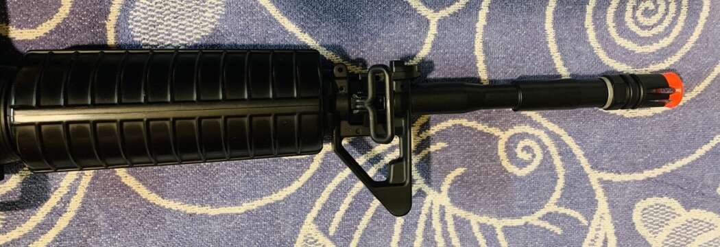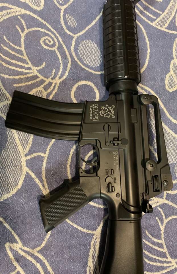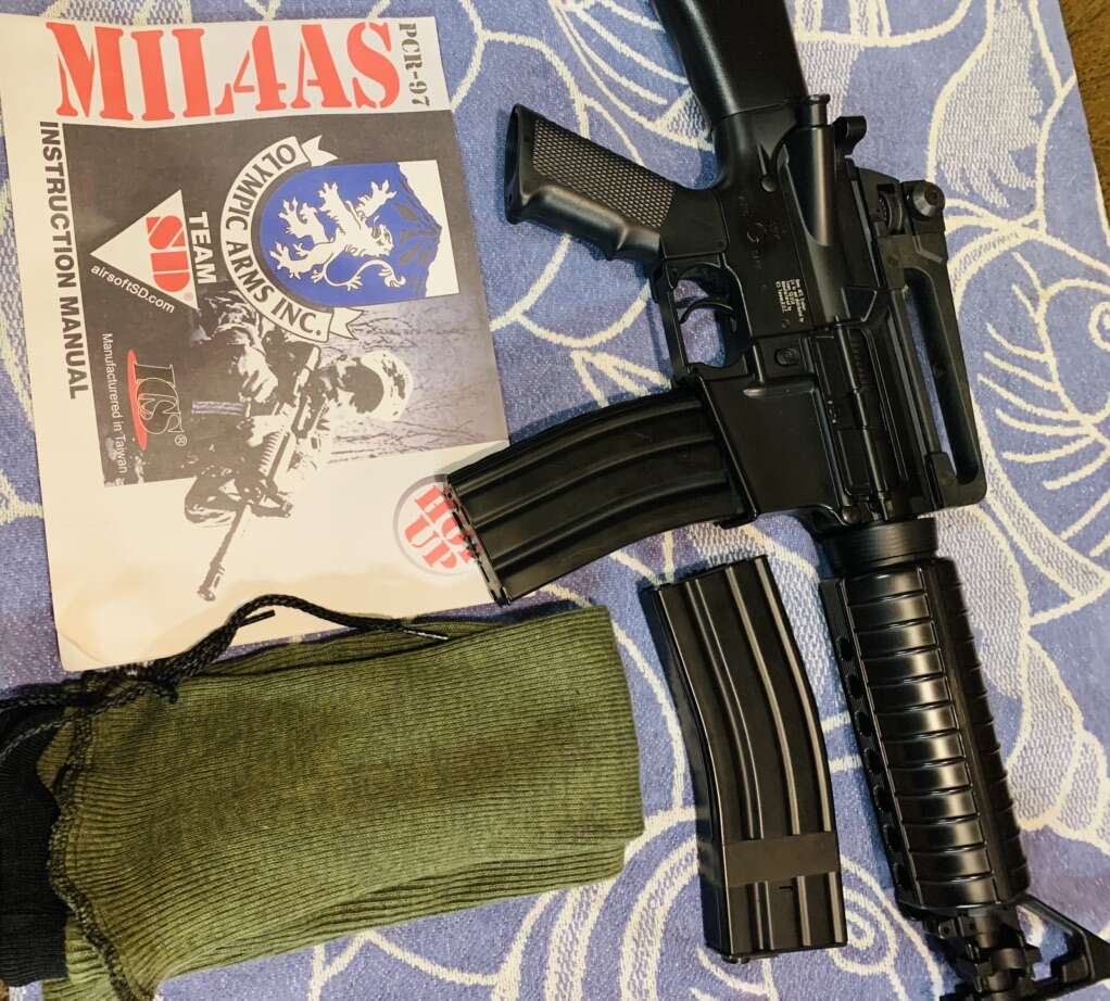 Olympic Arms Pro-Grade 6mm BB Airsoft. S/N BA0700425 Authentic Replica of the Colt M4 Rifle. Team SD Upgraded, ICS Manufactured. Condition: Excellent & Fully Functional. The Upgrade has a more powerful spring & features the M120 Tune Up Kit, which includes Reinforced Piston, Metal Spring Guide with Bearing, Aluminum Air Nozzle, a two port Cylinder, Aluminum Cylinder Head & Cylinder Head. Utilization of Precision Casts& Machined Aluminum enhances Structural Strength. 7 1/2 lb Weight & Balance & Full Metal Body. High Quality Polymer used for Fixed Stock, Hand Guard & Grip. BB Velocities in fps: 0.20g =410-430, 0.25g = 360-370. Adjustable Hop-Up. Selective Operation, Semi or Full Automatic. Selector Switch has 3 Positions : Safe, Semi & Full. Motor: I S Turbo 3000. Outer Barrel Length is 15 1/2” & Smooth Bore Brass Inner Barrel is 14”. Rifle overall Length = 34 1/2”. Fully operational Charging Handle & Bolt. Front Sight Post Height Adjustable with Tool. Rear Sight has Small & Large Peep Apertures & adjustment Knobs for Elev. & Windage. Receiver Upper opens for Cleaning & Maintenance. 450 Shot Manual Spin Up Magazines. Rear Sight & Carry Handle Group can be removed to allow use of various optics.