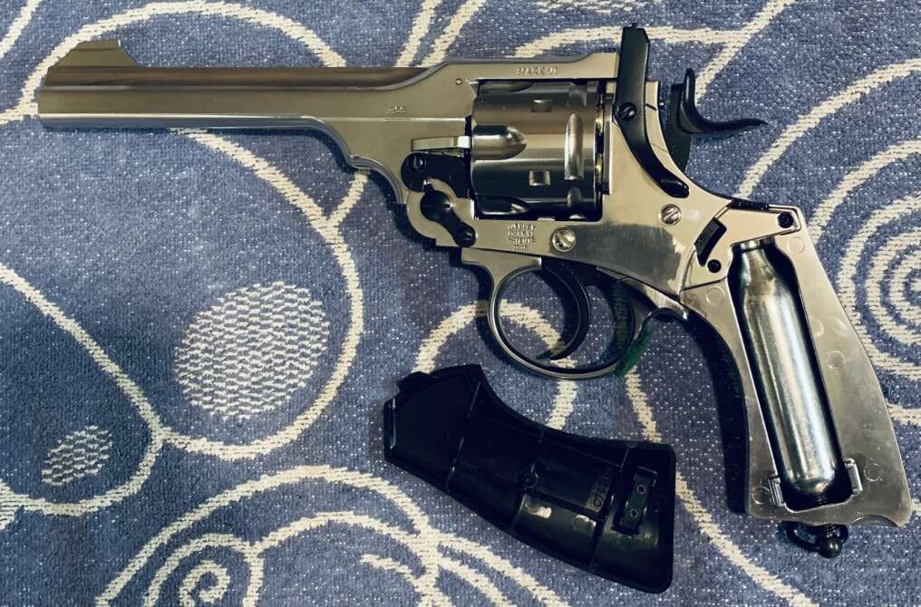 Full Scale & Weight - Based off Original Blueprints of the .455 Webley Revolver. Original 1915 Markings. Shoots .177” (4.5 mm) Prllets. Condition: Excellent. 6 Shot Single & Double Action. Authentic Break-barrel Function to extract & load Realistic Brass Cartridges. Cartridges can be loaded individually or with a Speed Loader, one provided. Pellets, individually, are inserted into the Base of each Cartridge for shooting. Power Source: A single 12g CO2 Cylinder housed in the grip. Length: Rifled Barrel 6” & Revolver 11 1/2” overall. All Metal Components except plastic Grips. Lanyard Swivel. Manual Safety. Finish: Exhibition Silver. S/N 16H37452