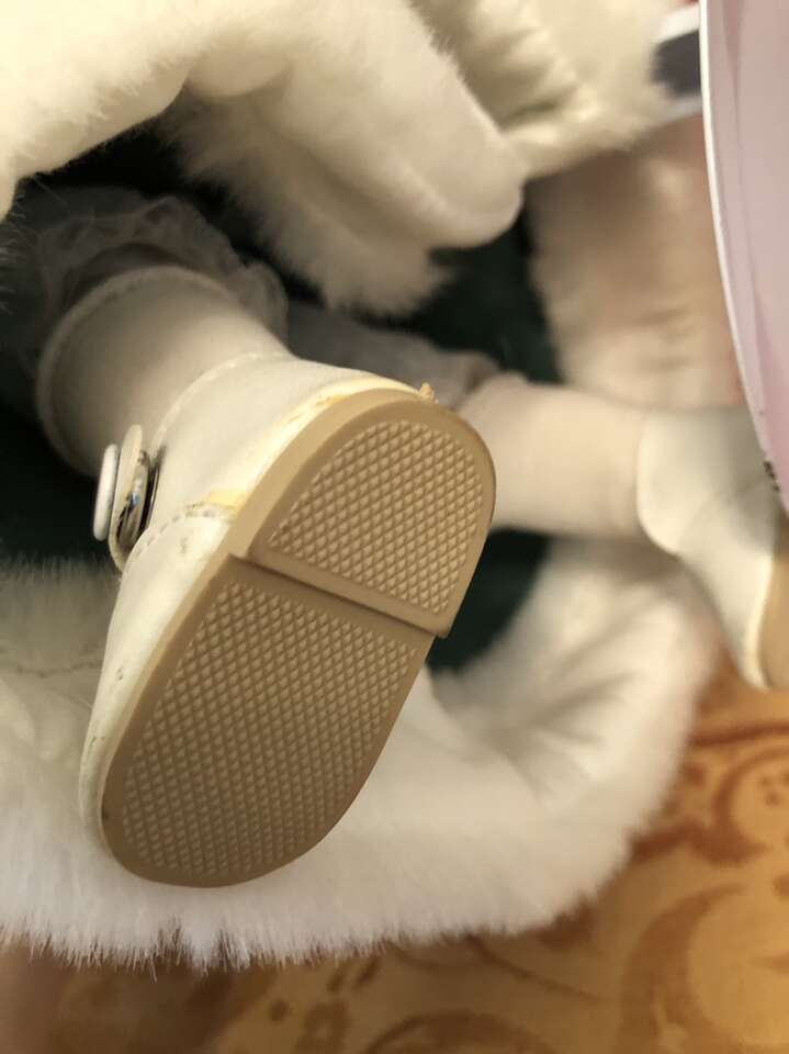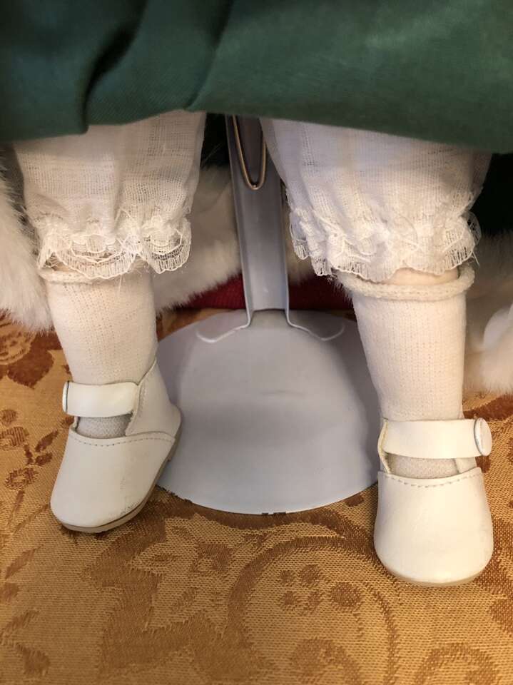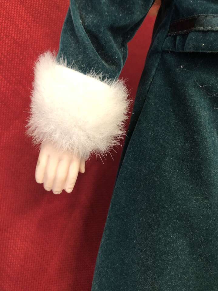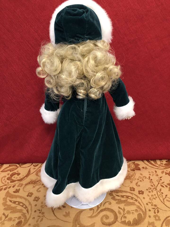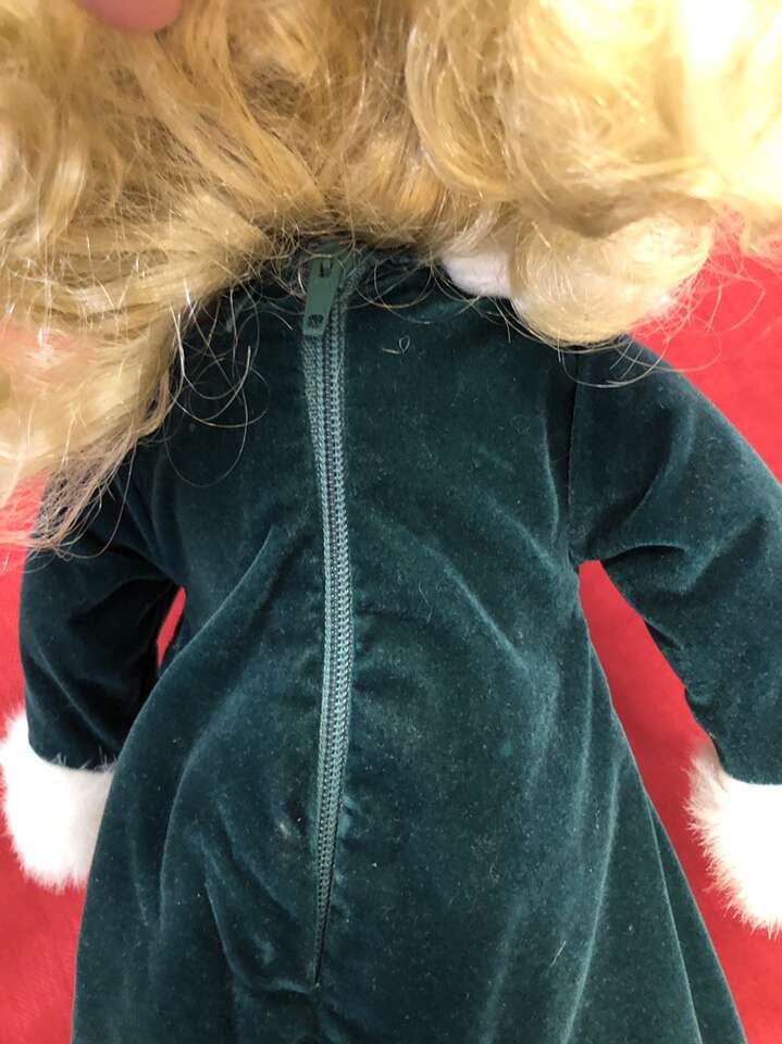 VenmoThis beautiful Christmas Porcelain Doll has lovely curly blonde hair and is on her own stand. She is wearing a beautiful green velvet dress trimmed with green satin ribbon, and the dress and the hat are trimmed in white fur. The dress has a zipper along the back, and she’s even wearing bloomers, socks, and white shoes with tread on the bottoms.