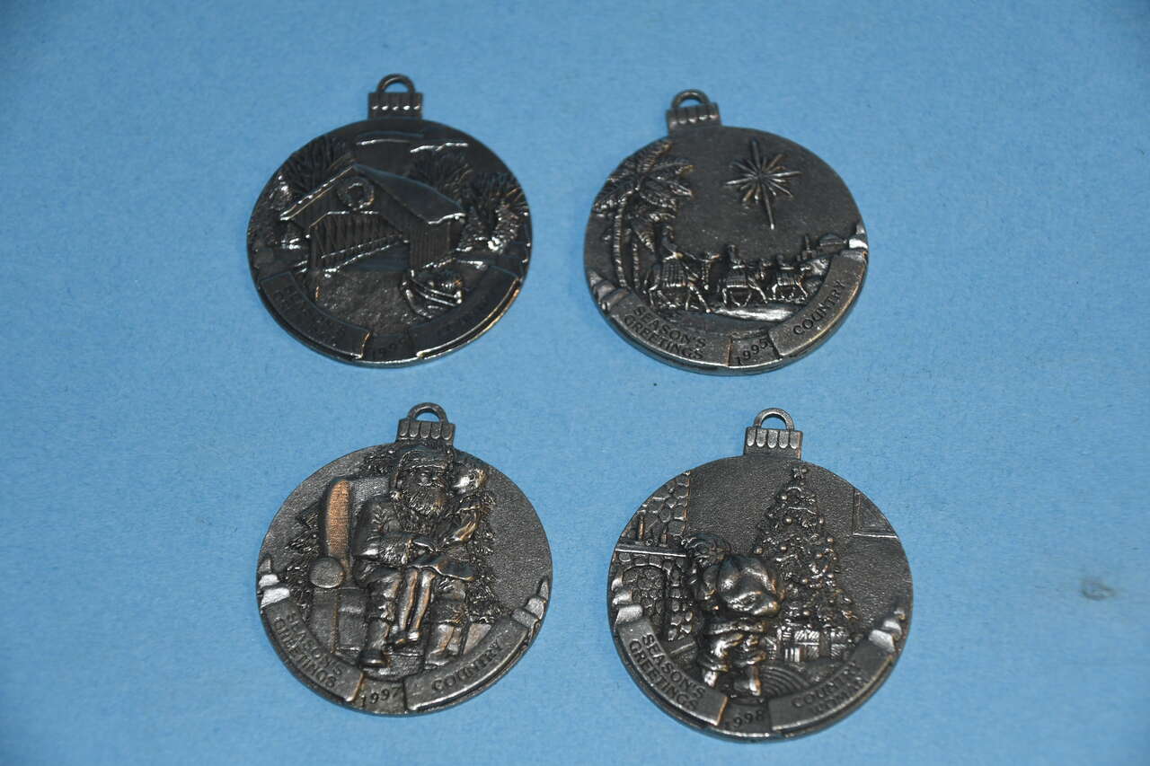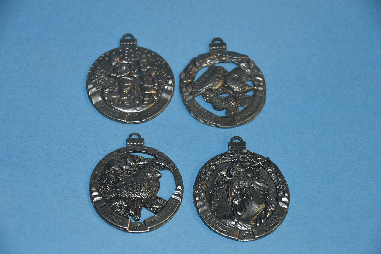 This Set of 8 BIRDS & BLOOMS + COUNTY PEWTER CHRISTMAS ORNAMENTS are from a smoke free home. They are about 2". The 2 Birds & Blooms Ornaments are dated 1996 & 1998. The 6 Country ornaments are dated 1994-1999. Questions??? Please ask. We are located in Plain City. Cash only please.