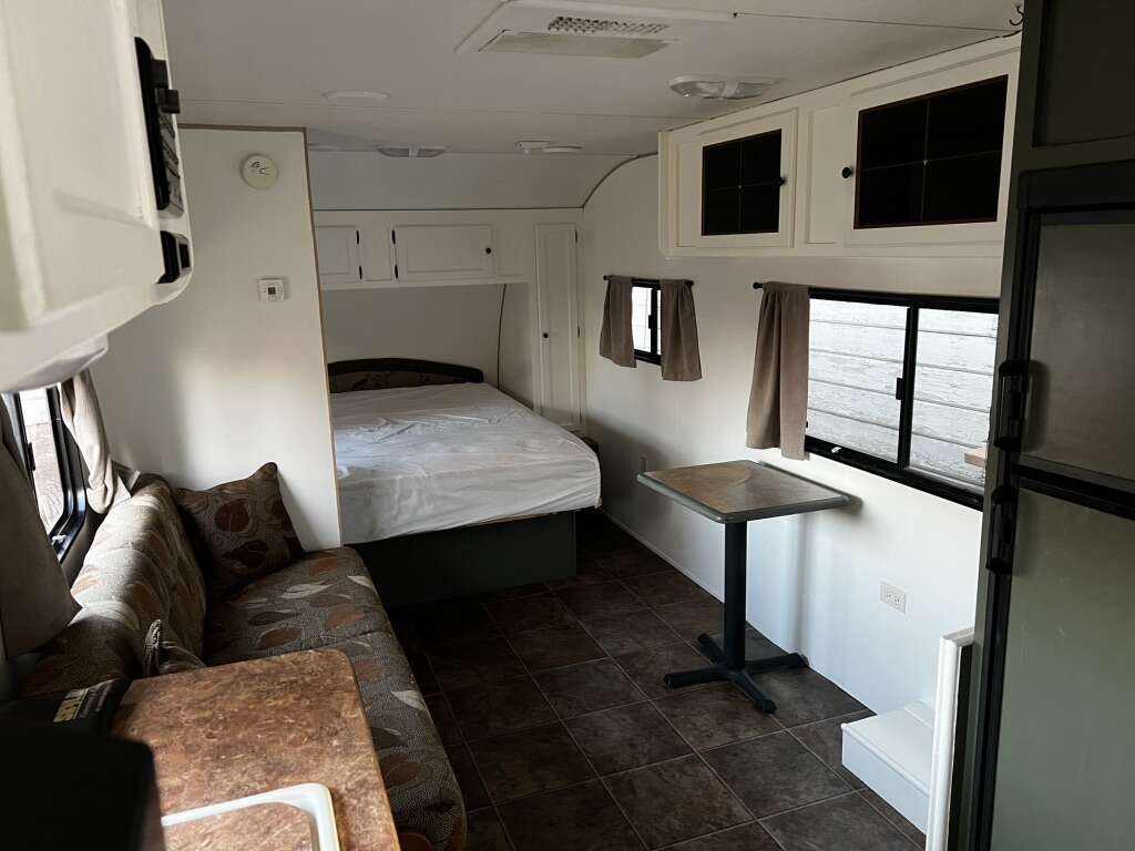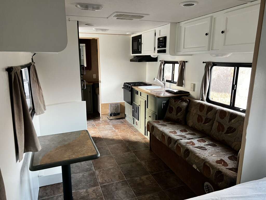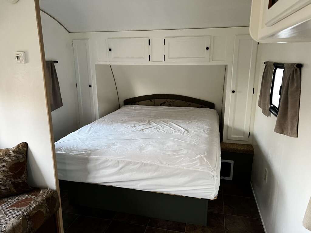 Great travel trailer with plenty of space and storage inside. Sleeps 4 people with a comfortable queen mattress and a sofa bed. The interior dinette was removed giving you extra space for gear, pets, kids, etc. Furnace and A/C work amazing keeping you cool in the summer and warm in the colder months. Very spacious bathroom with a bathtub, shower and HUGE closet. Oven, stove, microwave and fridge all work! Upgraded Queen Plush Mattress Small tv and satellite antenna Electric hitch New batteries 2 full size propane tanks 4 Brand new 7,500 lb stabilizing jacks Pet door added to underneath storage area New carbon monoxide detector