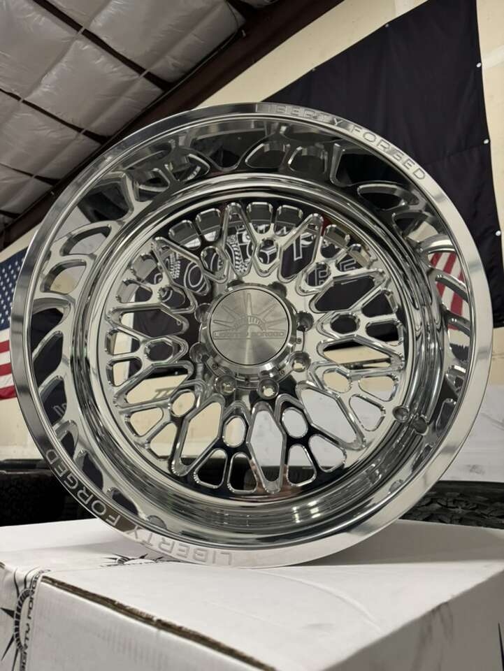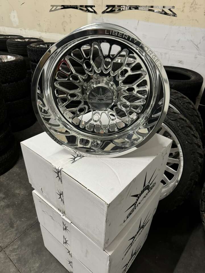ZelleBRAND NEW IN BOX 22x12 liberty forged wheels -44 offset Billet forged wheels Polished mirror finish Billet floating caps Model: LBTY15