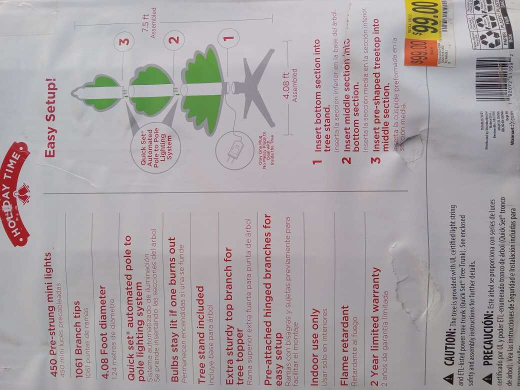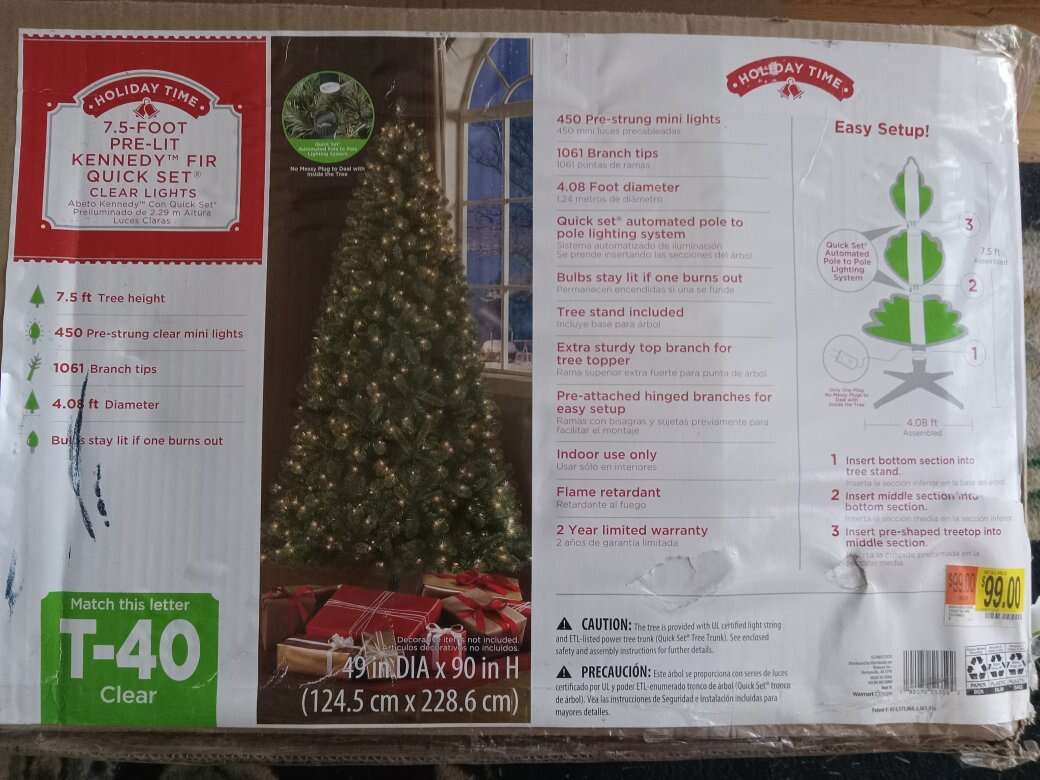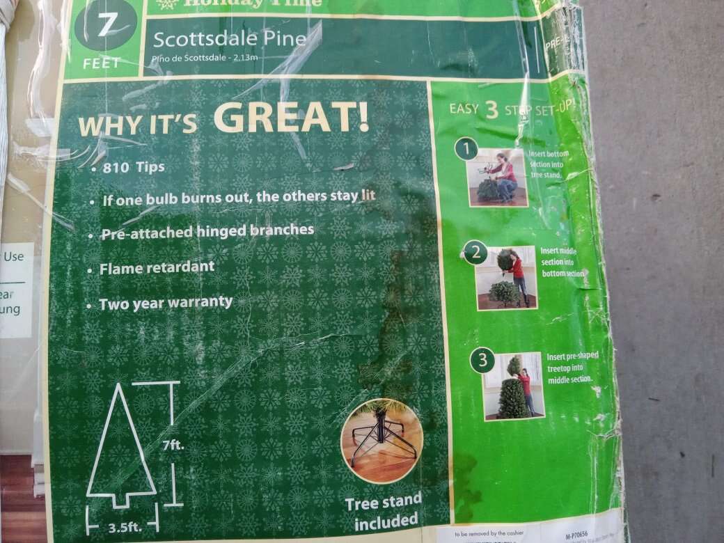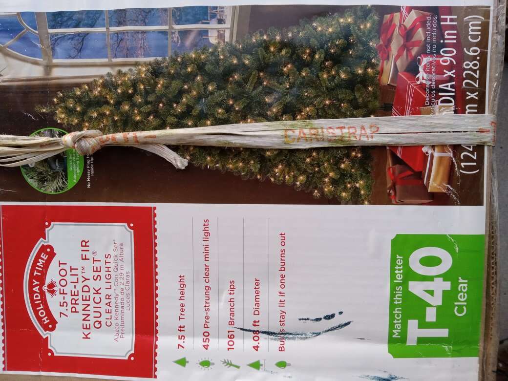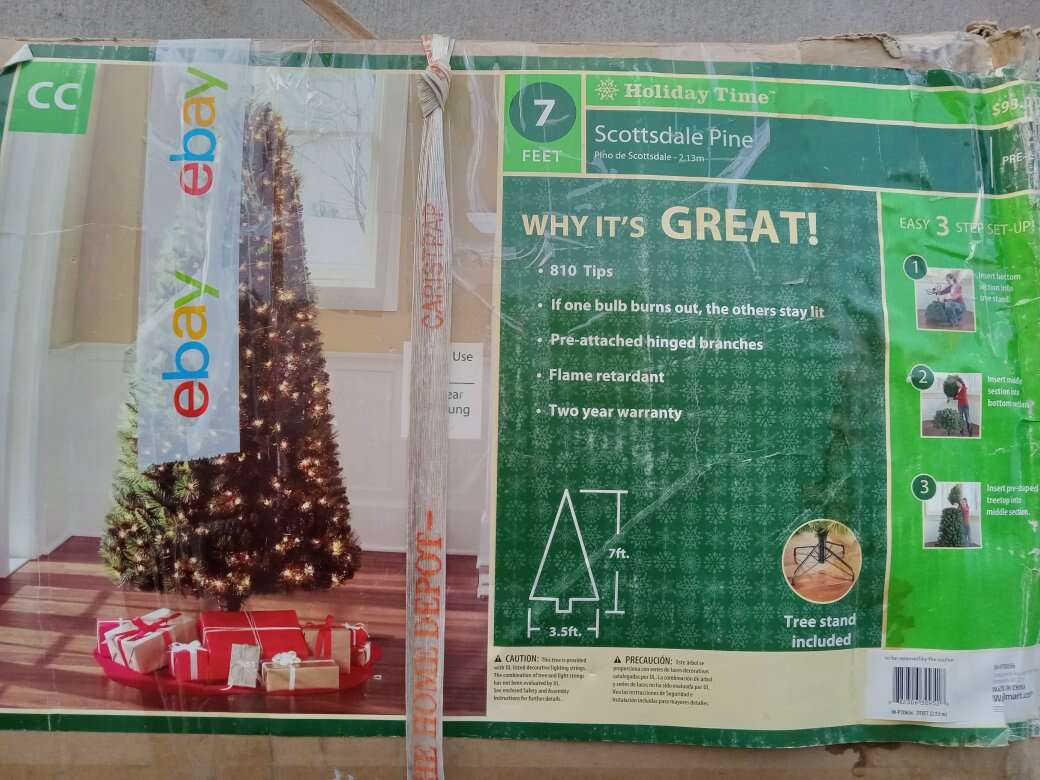 Venmo(Price reduced on 12/9) Up for sale is one used 7ft and 7.5ft full size pre-lit Christmas Tree with stand. These trees are pre-strung with white incandescent liguts but I am including 4 boxes of brand new Stay Lit multi-color LED Lights! These light strands are the way to go for pre-lit Christmas trees, because all the lights are guaranteed to stay on even when another bulb is missing, burnt out, and even broken in half.