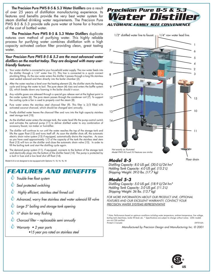 Rebuilt Precision Water Distiller - PWS 8-5 120V 9A automatic counter top model, 8 gallon per day production with 4 gallon storage, 304 stainless steel, Automatic fill & low water shut off, manual drain. 1 year parts and labor warranty. 1/2 the cost of a new unit.