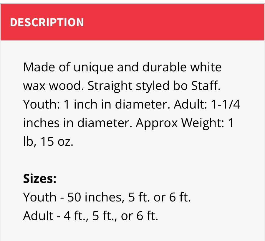 Description- 5’ long white wax bo staff for youth. See photos for more product information and specifications.