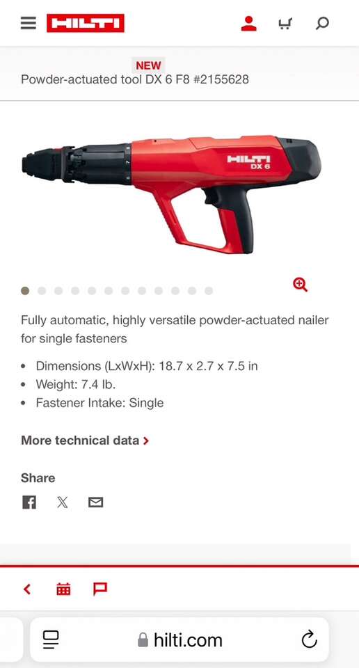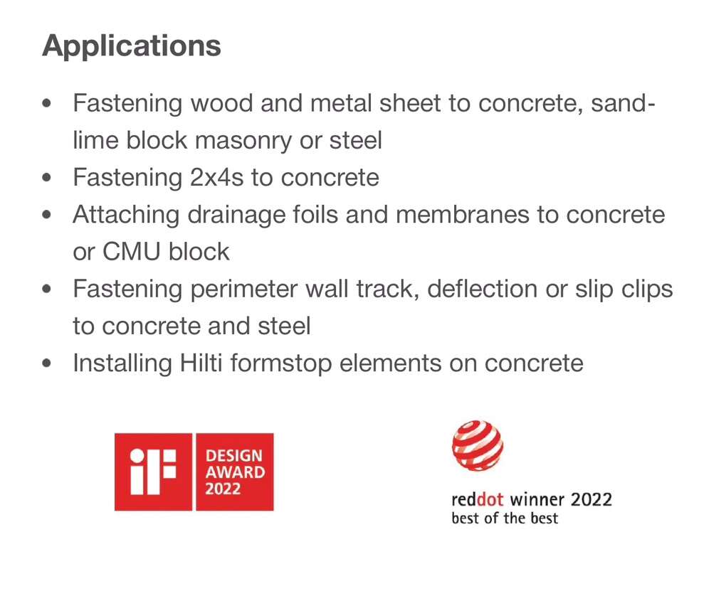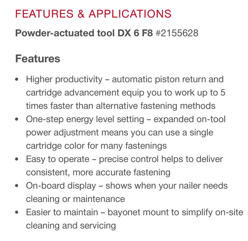 Description- Fully automatic, highly versatile powder-actuated nailer for single fasteners to attach wood, metal, hardware, etc. to concrete, masonry or steel. Includes cleaning kit and hard sided storage case. See photos for more product information and specifications.