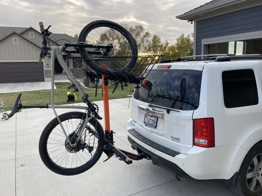 ApplePayRENT ME! The Alta Rack 6 Pack hitch-mounted vertical bike rack holds up to 6 bikes with adjustable spacing between baskets. Requires 2” hitch.