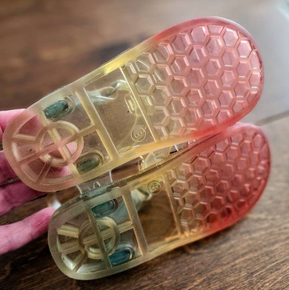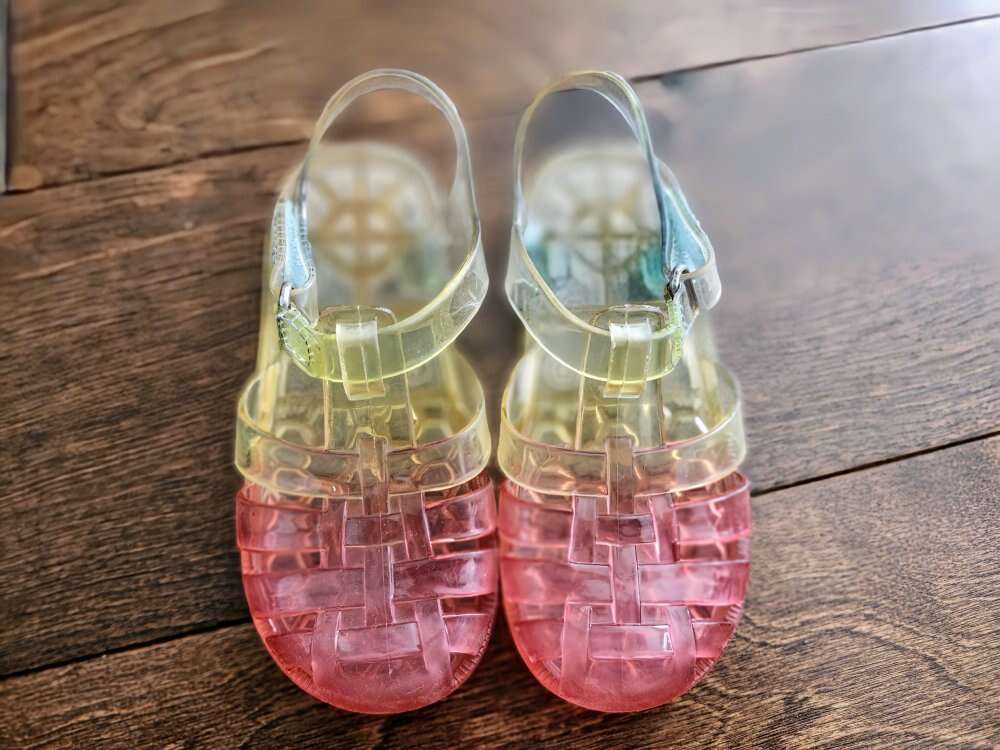 These are cute sandals, size 8. It uses velcro to close. Easy to throw in the wash to clean.