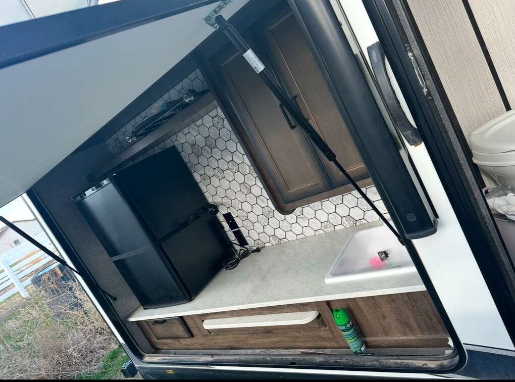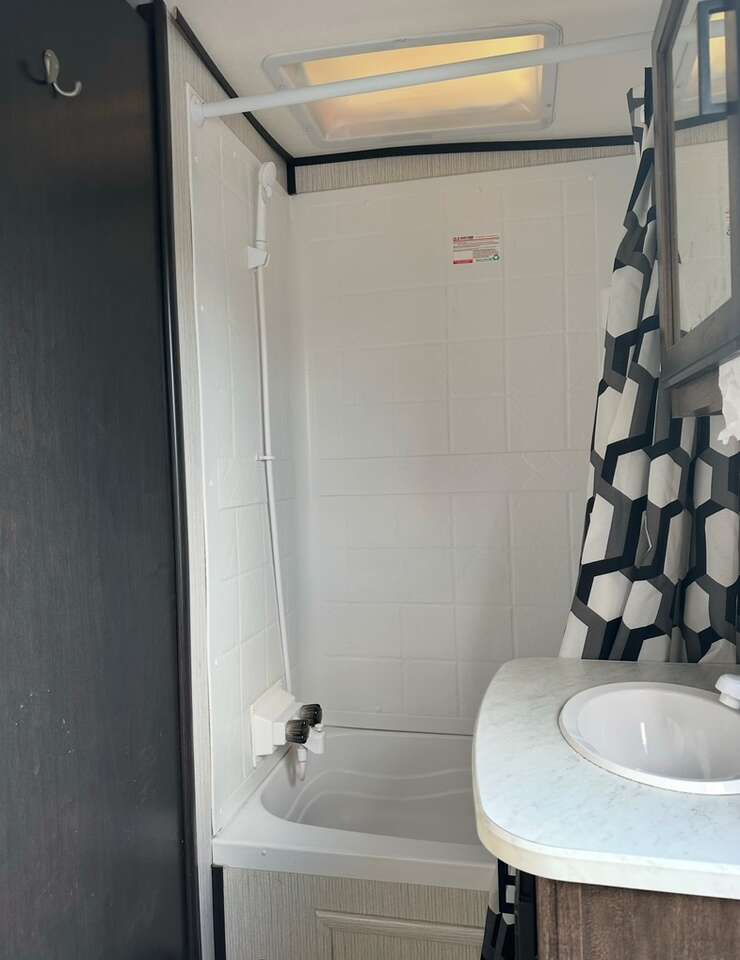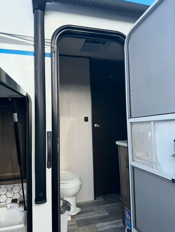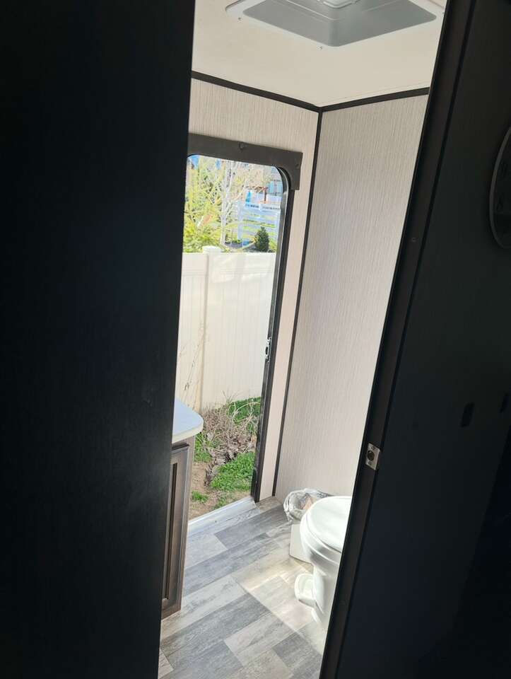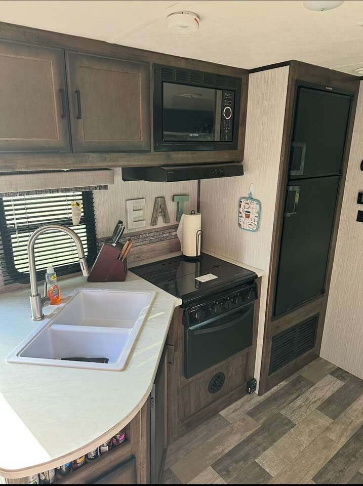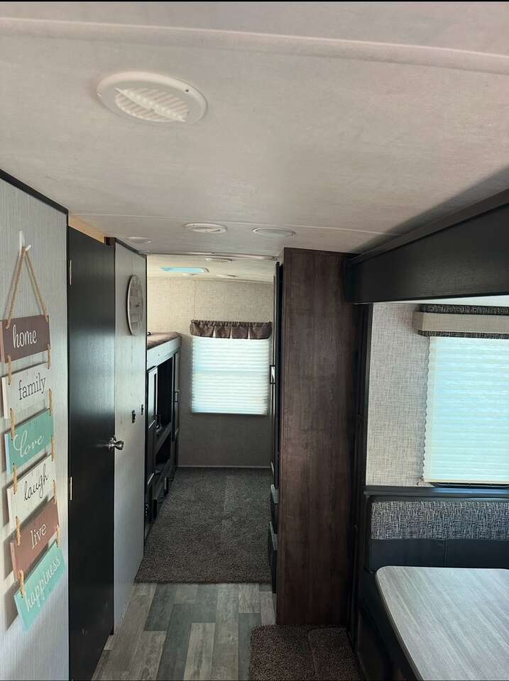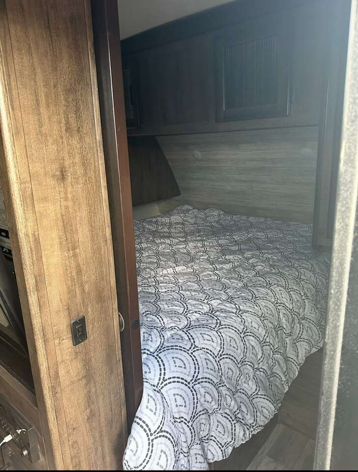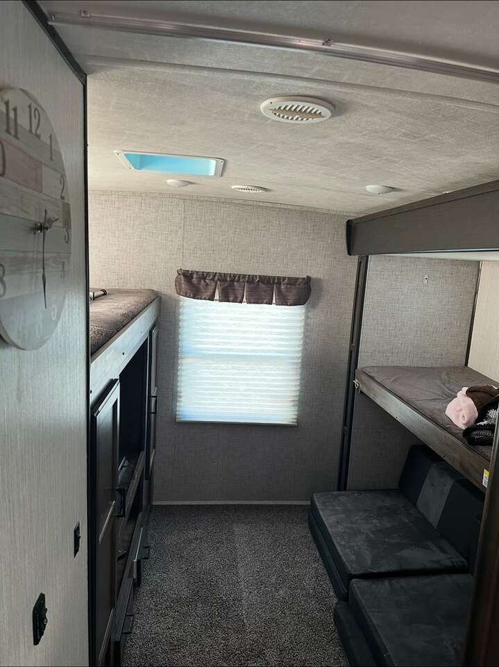 Perfect bumper pull that’s sleeps 10. (2 in the master bedroom, 2 on couch that pulls out, 2 on table that folds down, 4 in bunkhouse) Indoor and outdoor sound system, entertainment system in living room and bunk house. Out side kitchen and shower, entrance to the bathroom from out side big kitchen with lots of storage electric jacks.