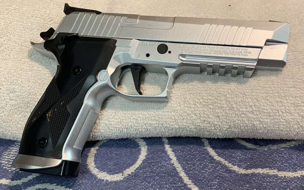 Semiautomatic caliber.177/4.5mm Pellet. S/N 18D10306. Made in Japan. Condition: Excellent. Sole Owner & Carefully Maintained. It is a Full Size Licensed Replica of SigSauer’s X-5 Competition Firearm. All Metal except for some high impact Polymer. Powered by One CO2 12g Cylinder housed inside the Grip. Magazine houses a 20 Round Rotating Plastic Belt. Simply open the back and insert each Pellet into an open slot face forward. A Picatinny Rail is provided located on the Frame just in front of the Trigger Guard. Sights: Fixed Post Front & Notches Fully Adjustable Rear. 5.5” Rifled Steel Barrel. Overall Length is 9”. Weight empty: 3 lbs. A moderate 5.5 lb Trigger Pull which also rotates the Magazine Belt. Velocity: Up to 380 fps. The SA Action provides felt Blow Back. It is designed to feel like the Real Thing & well constructed for Reliability & Strength.