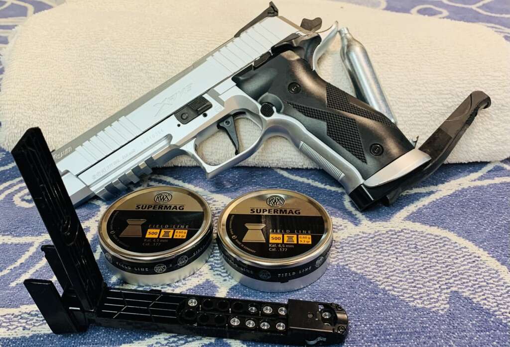 Items Included: Pistol. Three 20 Round Plastic Magazines. SixCrosman 12g CO2 Cylinders. Two Tins RWS Cal. 177/4.5mm 9.3gr Pellets. A Silicone Treated Gunny Sock. Owner’s Manual.