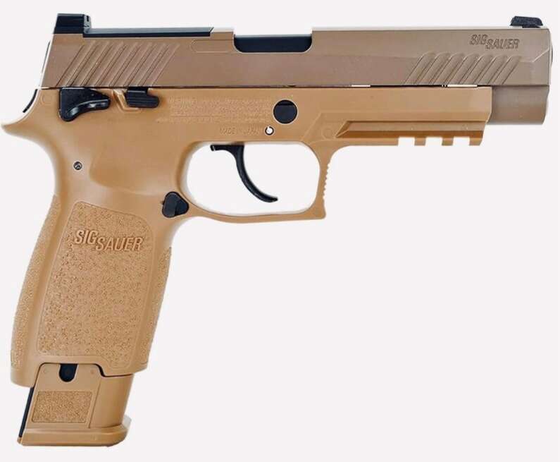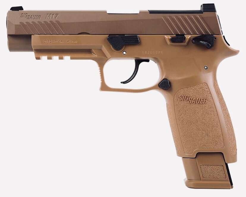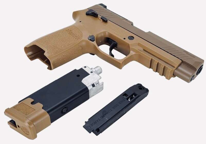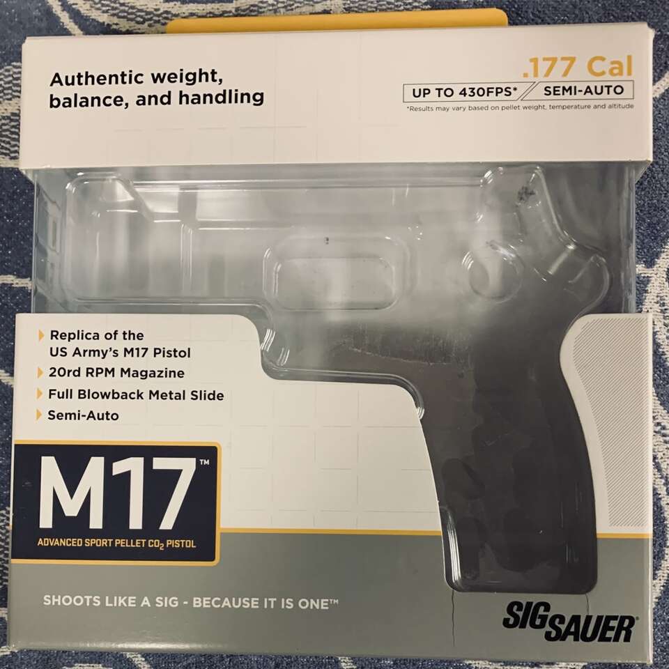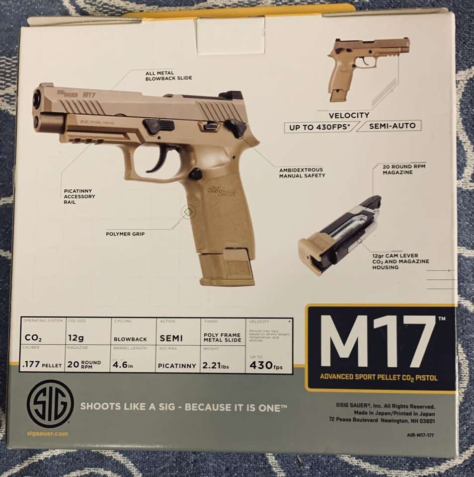 Semiautomatic caliber.177/4.5mm Pellet. S/N 19H06663. Made in Japan. Condition: Excellent. Sole Owner & Carefully Maintained. It is a Full Size Licensed Replica of SigSauer’s P320-M17 Military Firearm for the US Army. All Metal except for some high impact Polymer. Authentic weight, balance & handling. Sights: Fixed Post Front& Notched fully adjustable Rear. Powered by One CO2 12g Cylinder housed inside the Magazine Assembly. The removable Pellet Magazine has a 20 Round Rotating Plastic Belt. Simply open the back and insert each Pellet into an open slot face r forward. Once loaded, the Pellet Magazine is inserted into the Magazine Assembly. Now the Assembly is slid into the Grip for shooting. This Technique provides a No Leak Loading Cycle with the CO2 Cylinder. A Picatinny Rail is provided located on the Frame just in front of the Trigger Guard. 5.5” Rifled Steel Barrel. Overall Length is 10”. Weight empty: 3+ lbs. A moderate 5 lb Trigger Pull which also rotates the Pellet Magazine Belt. Velocity: Up to 430 fps depending on Pellet Weight & Rate of Fire. The SA Action provides good Blow Back & Felt Recoil. Pistol can be field striped. Dry Fire capable. It is designed to feel like the Real Thing & well constructed for Reliability & Strength.
